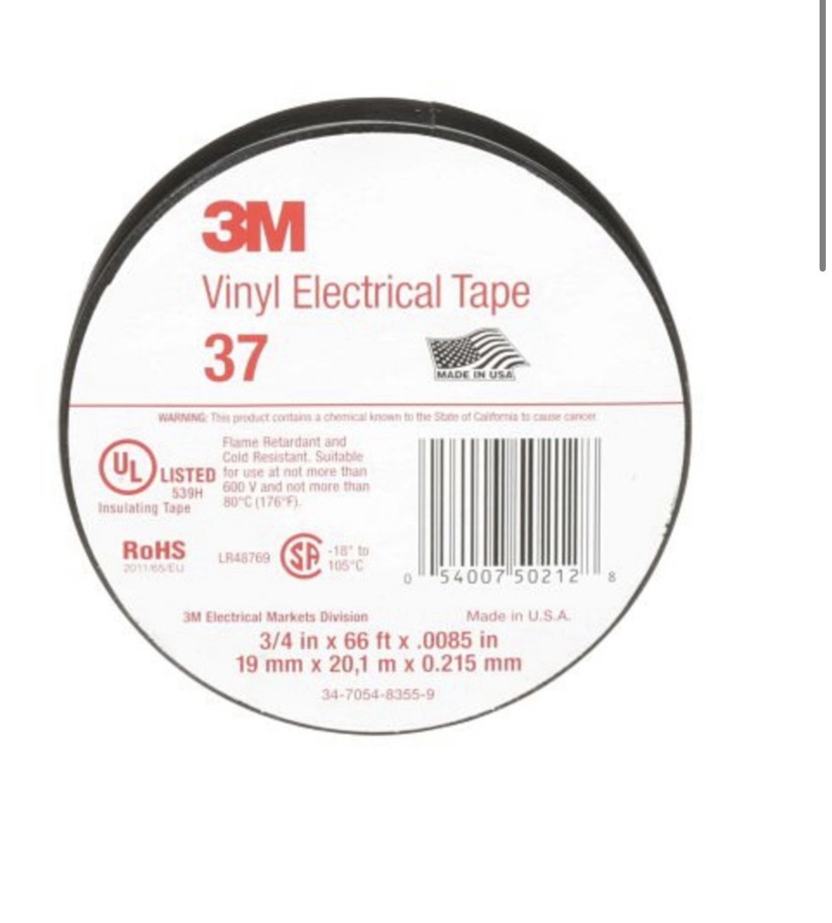3M 37 Vinyl Electrical Tape 3/4 66' Black, 10 Rolls