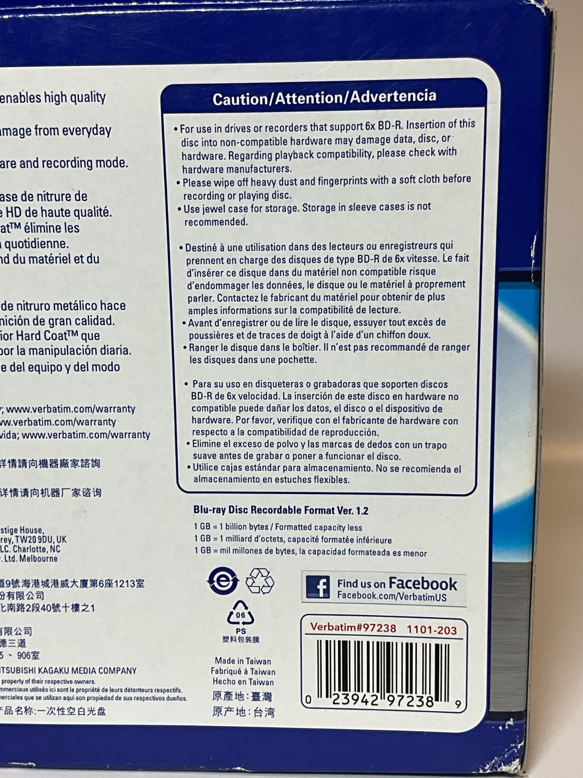 Verbatim BD-R Blu-Ray Disc, 25GB, 6x, 2x 10/Pk VER97238 20 Discs Total FREESHIP
