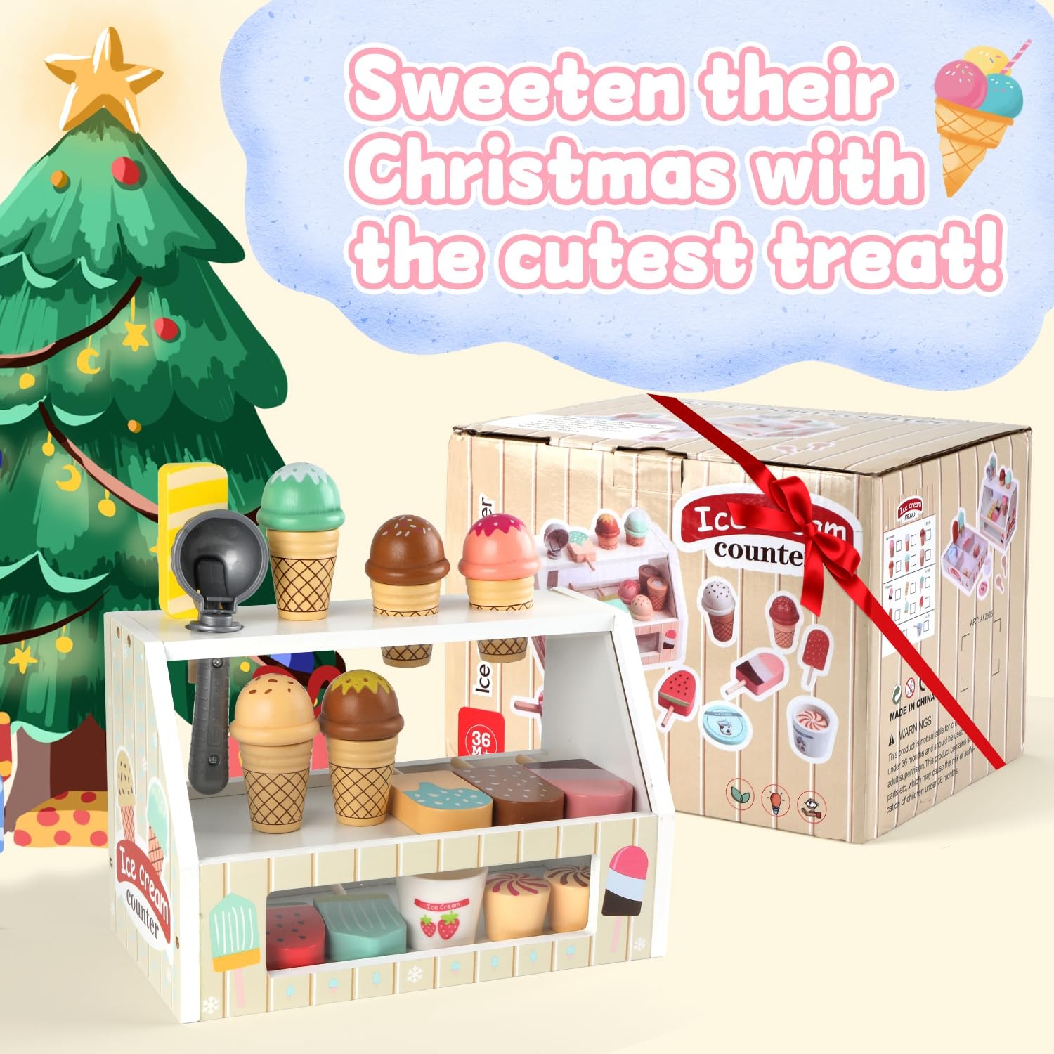 Ice Cream Toy, 46 PCS Wooden Pretend Play Set for Kids, Food Counter Shop Pla...