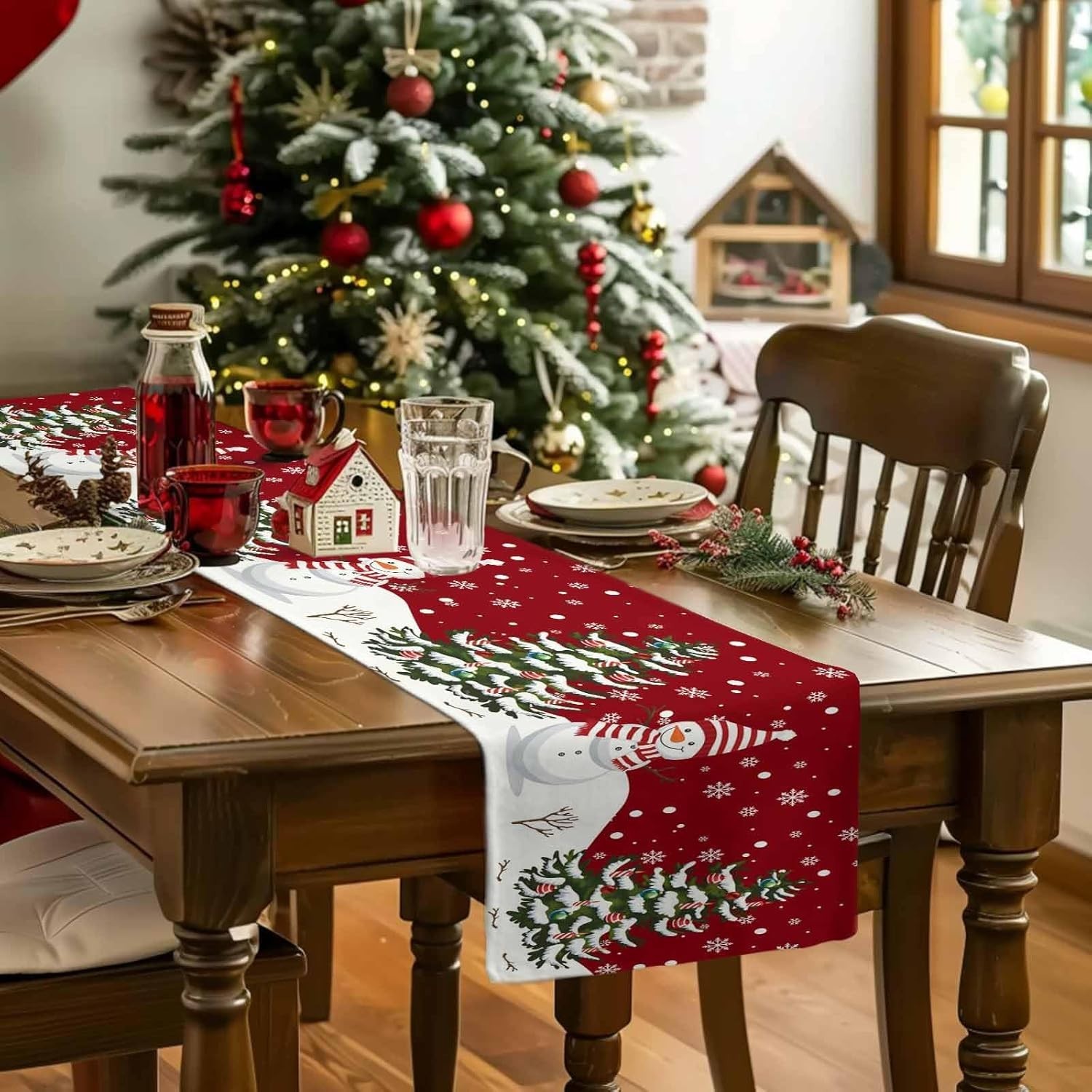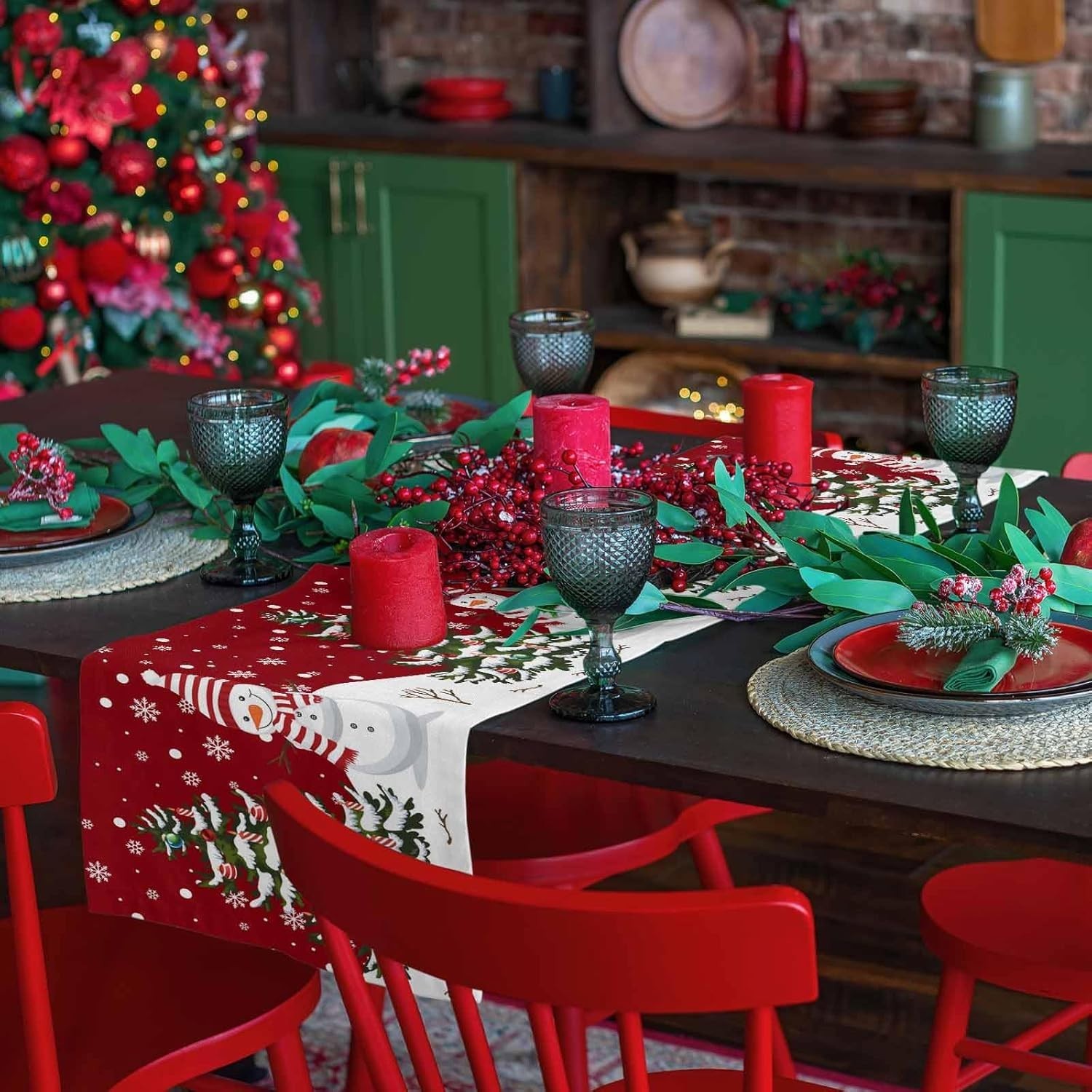 Christmas Table Runner - Cotton Linen 72 Inches, Snowman Rustic Red Snowflake...
