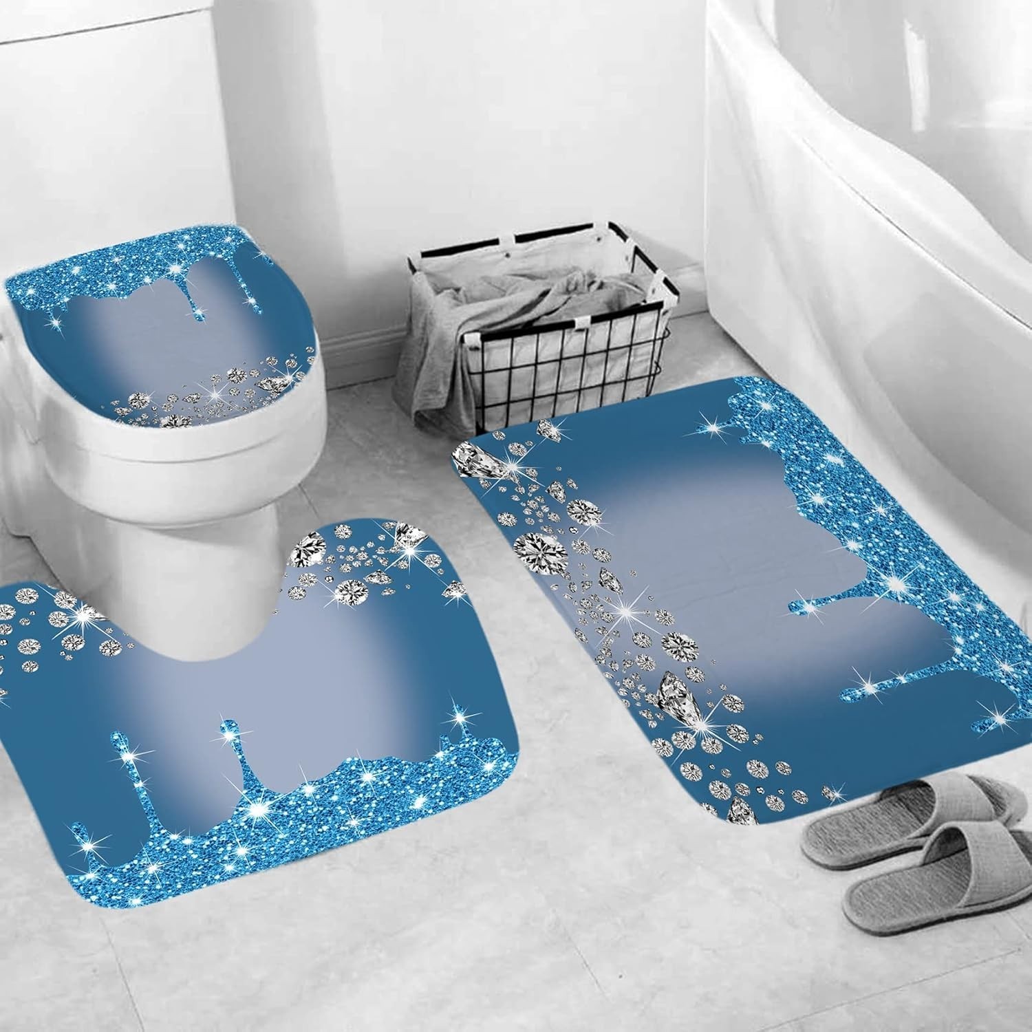 как выглядит 4 Pcs Glitter Diamond Shower Curtain Sets, Blue Shiny Drips Bath Decor with R... фото