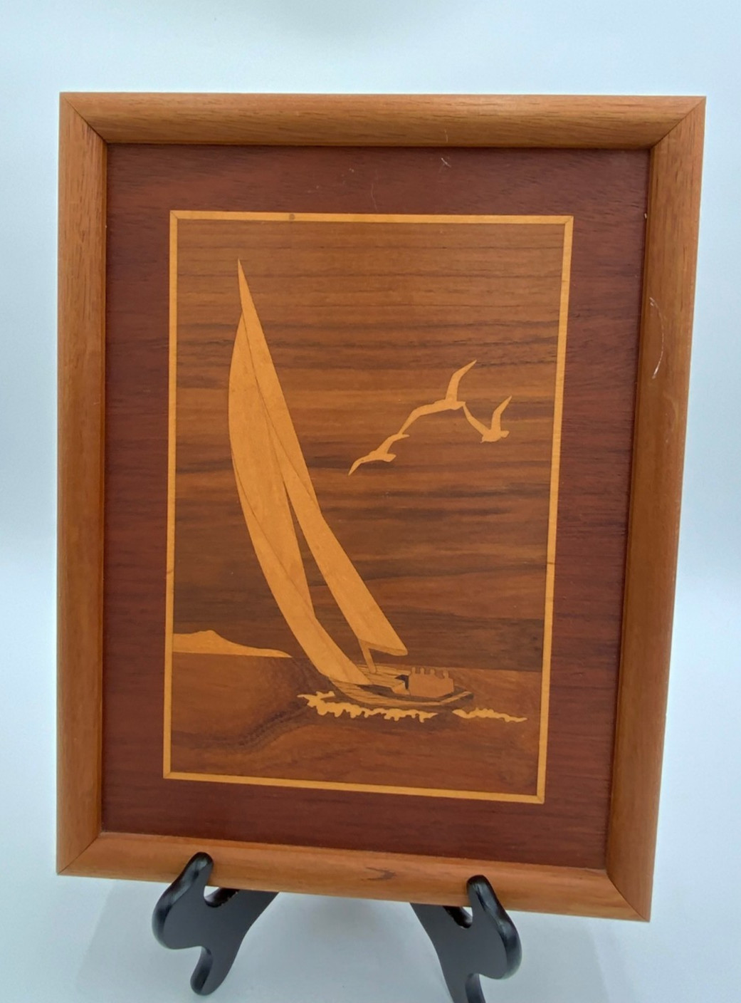 • Hudson River Inlay Marquetry Sailing Boat Jeff Nelson Framed Wood Art
