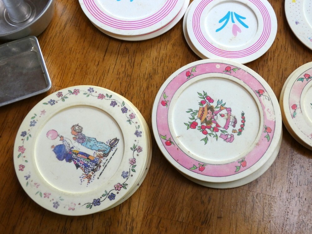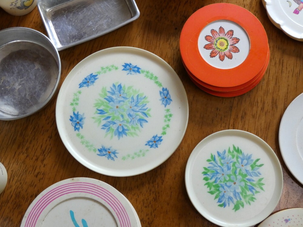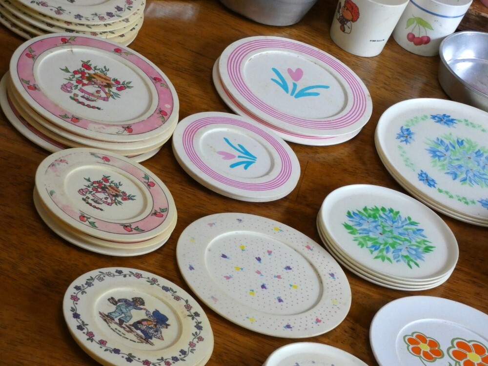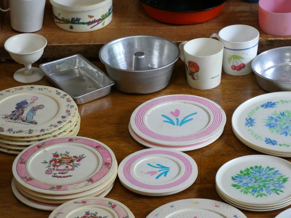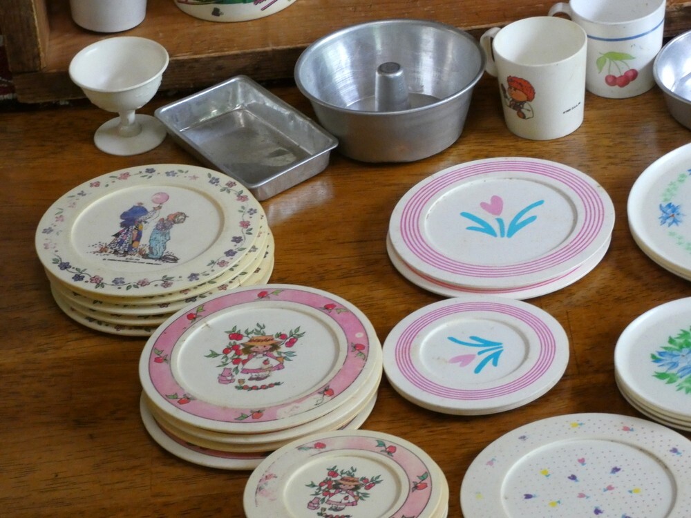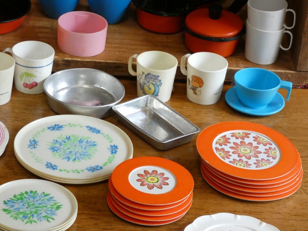 как выглядит Vintage Childrens Play Dishes Pots and Pans Lot Plastic and Aluminum 76 Pieces фото