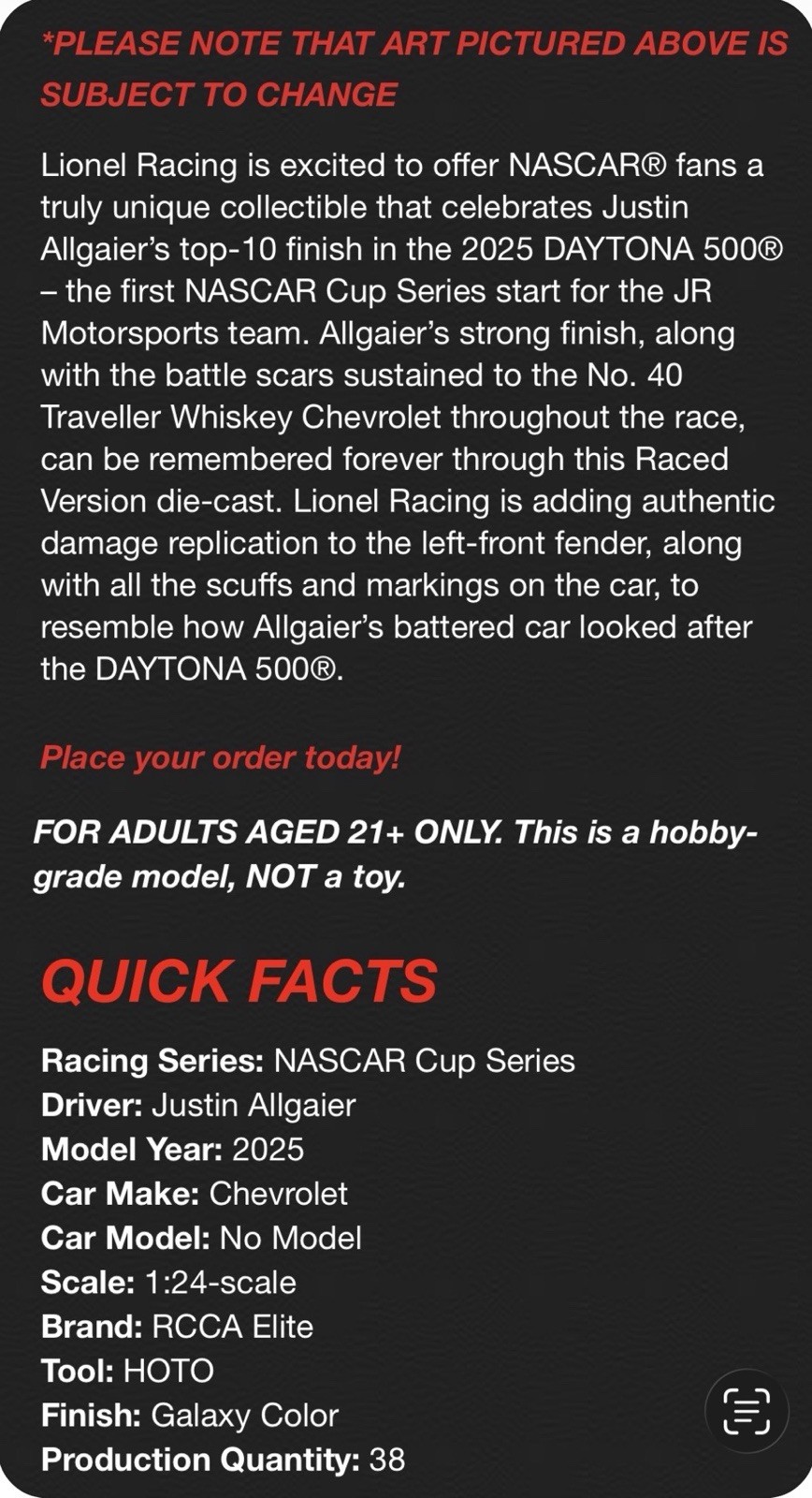как выглядит 2025 Justin Allgaier Traveller Whiskey Daytona Raced Version Galaxy Elite 1:24 фото