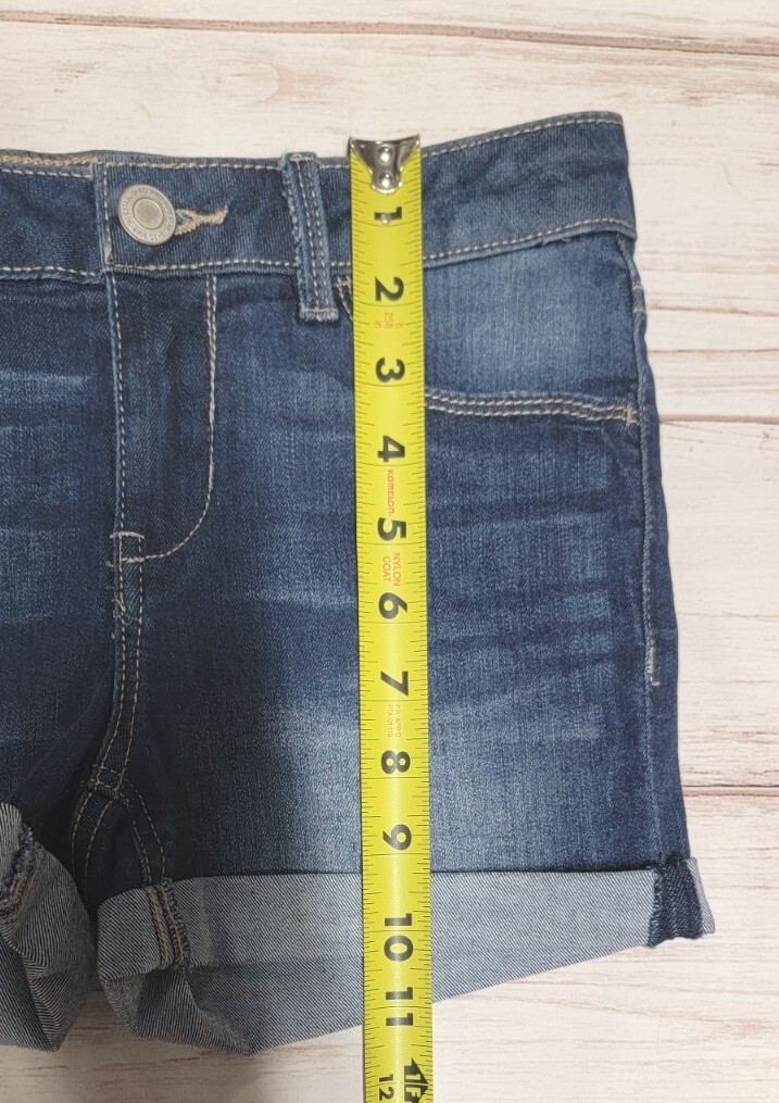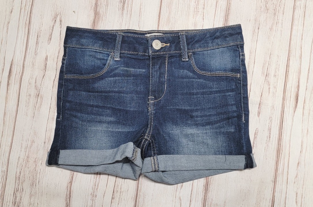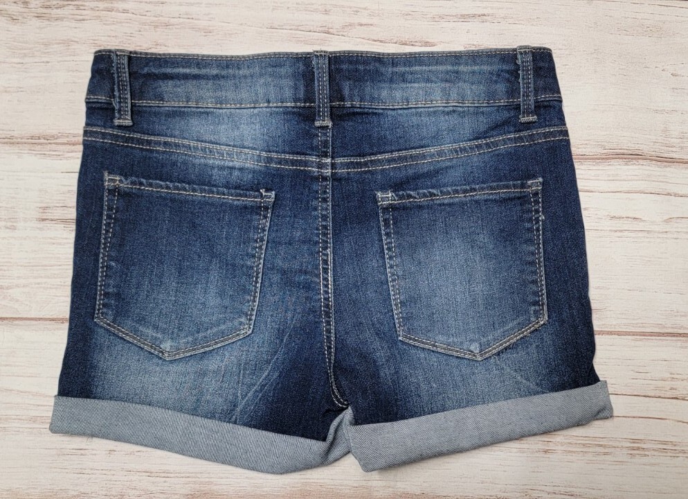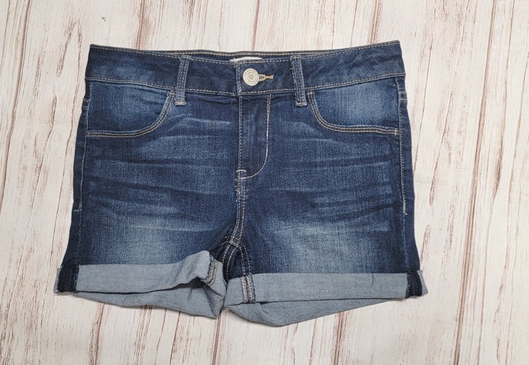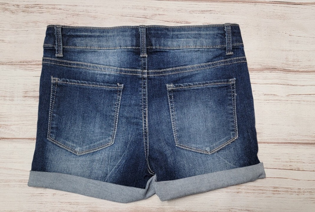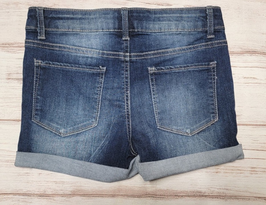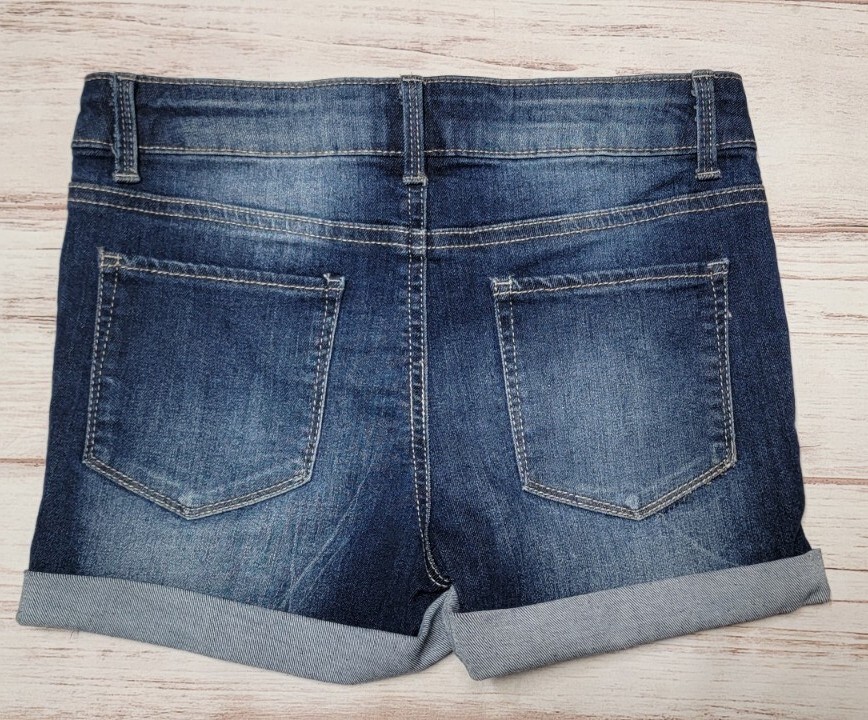 как выглядит GIRLS SO 12 DARK WASH DENIM STRETCH CUFFED WHISKERED ADJUSTABLE JEAN SHORTS фото