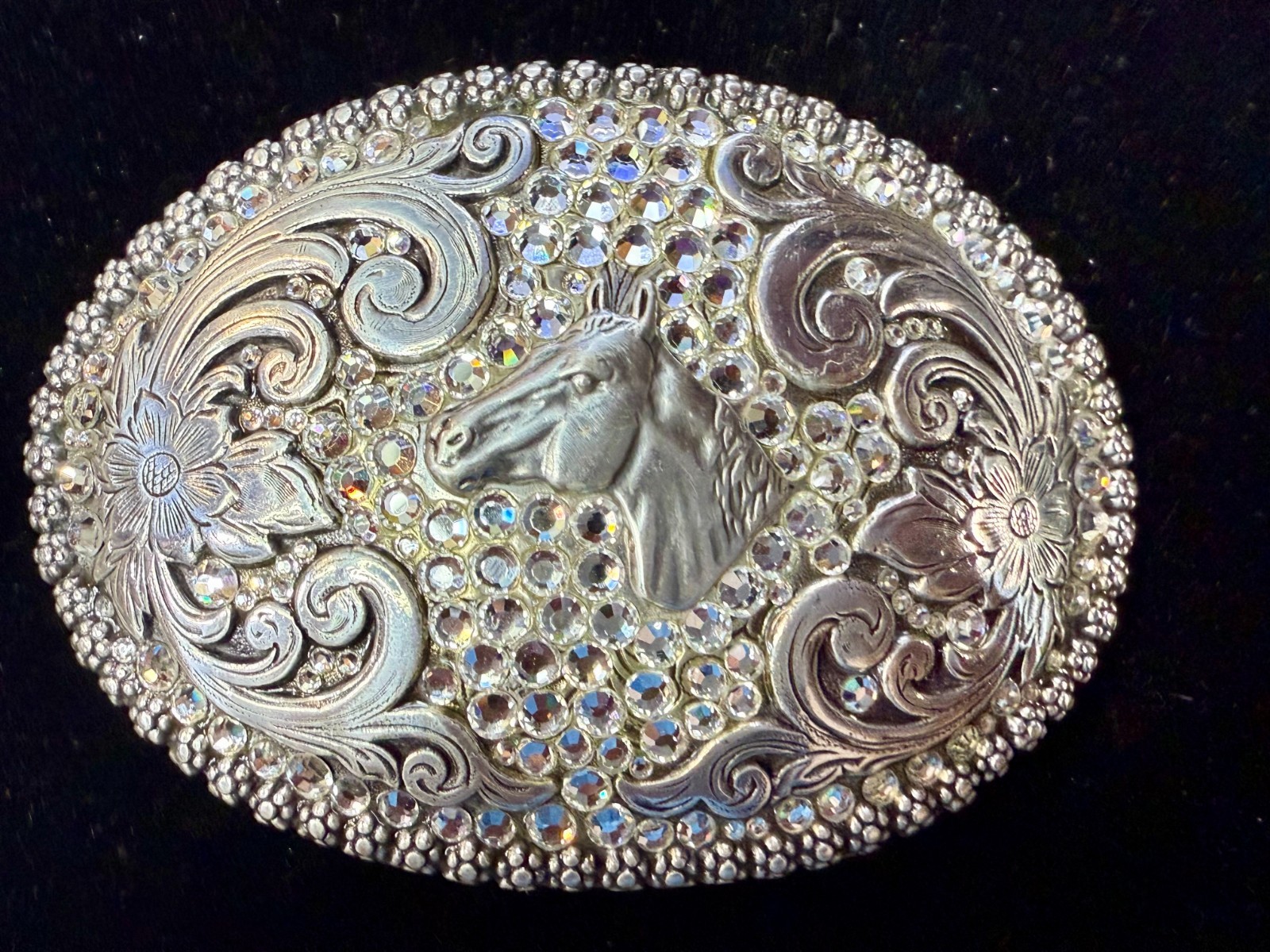 • Horse Head Jeweled Rhinestone Silver Tone Berry Border Oval Nocona Belt Buckle