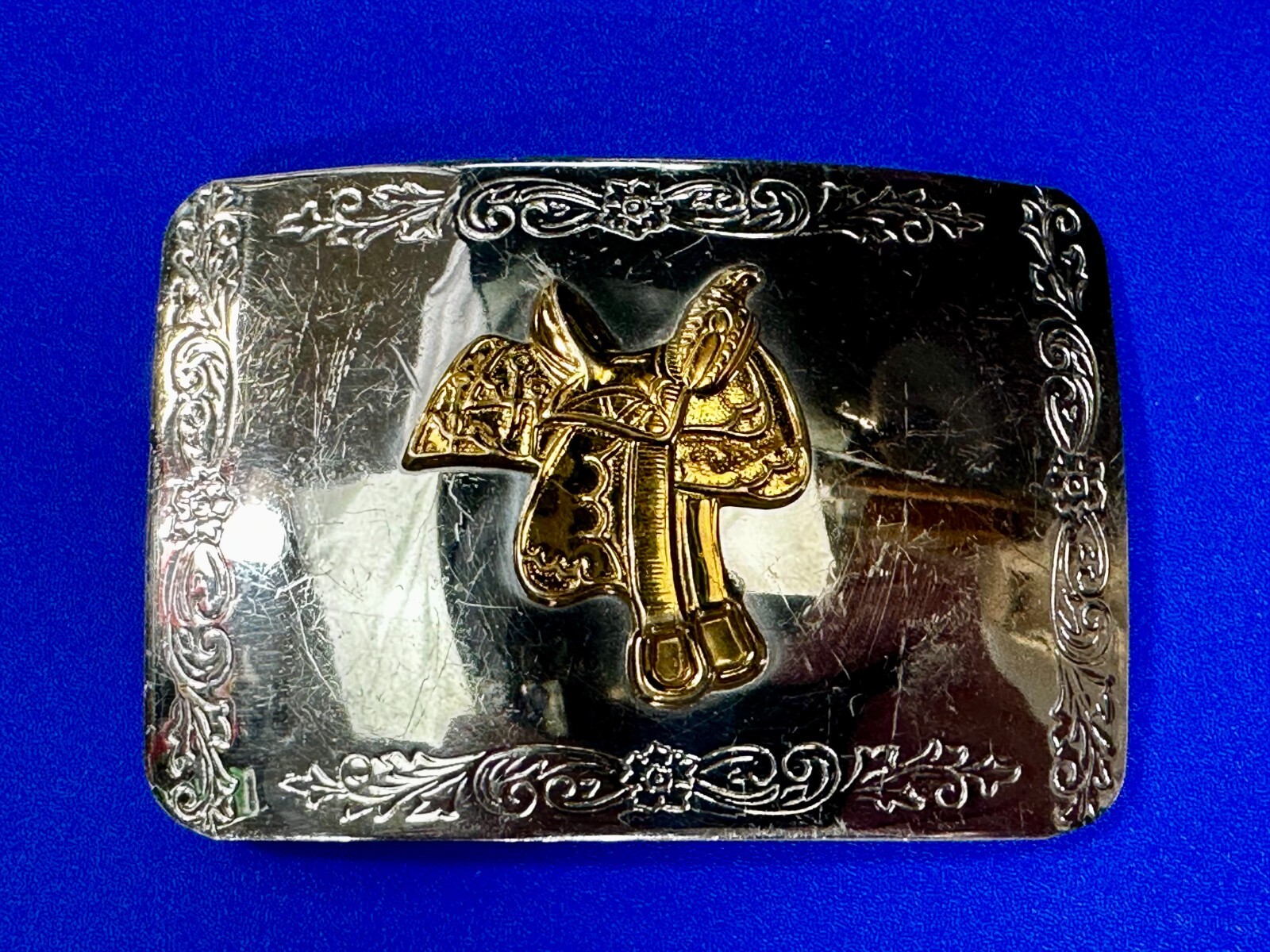 Horse Saddle Vintage Nickel Silver Western Lovers Two Tone Belt Buckle