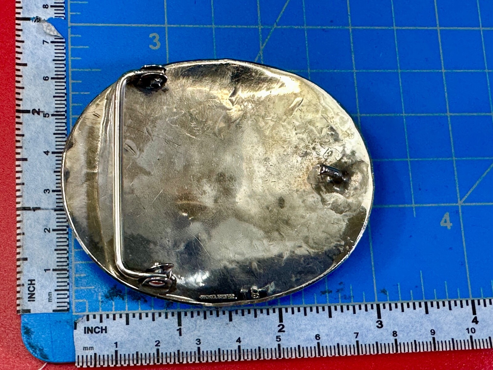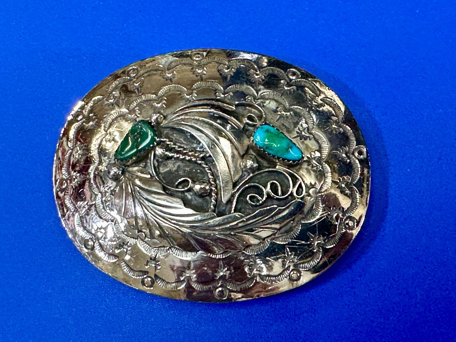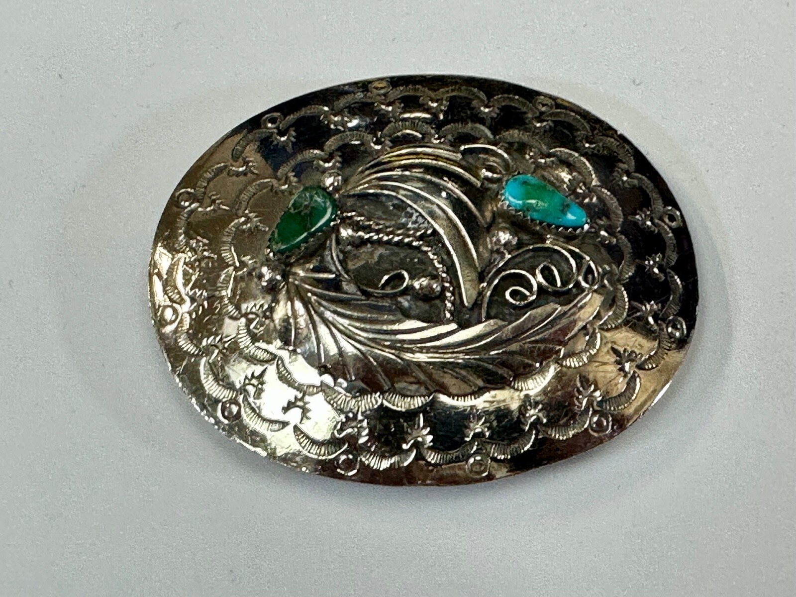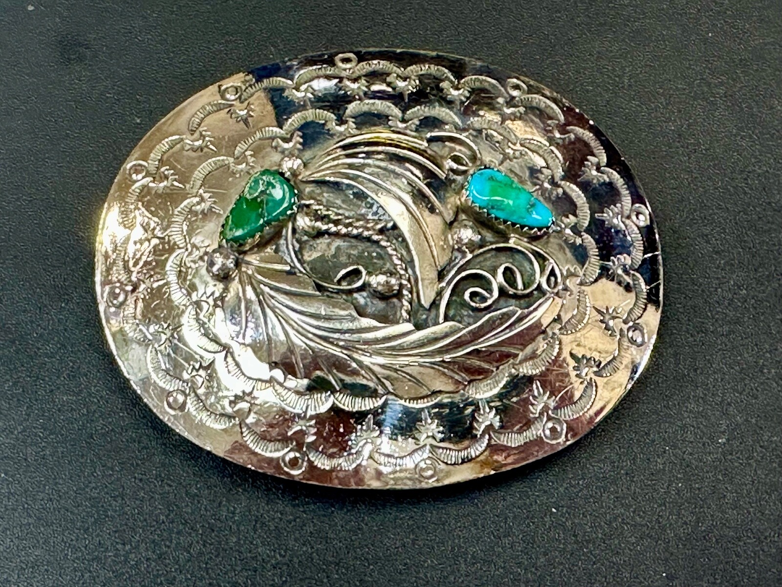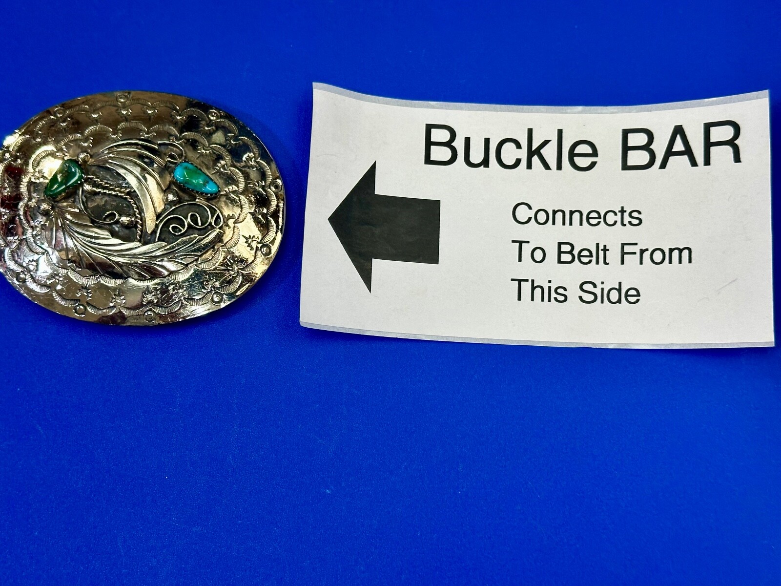 • Native American Turquoise Feather Nickel Silver Belt Buckle Signed TB