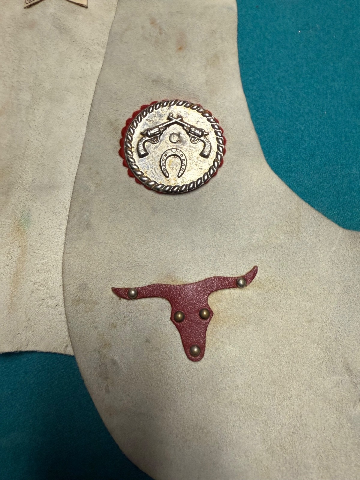 как выглядит Vintage , light beige childs suede Cowboy vest with medalions фото