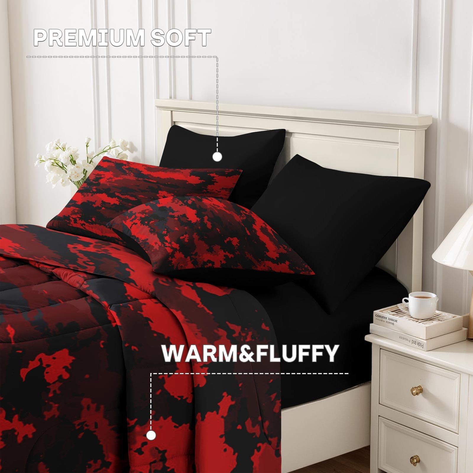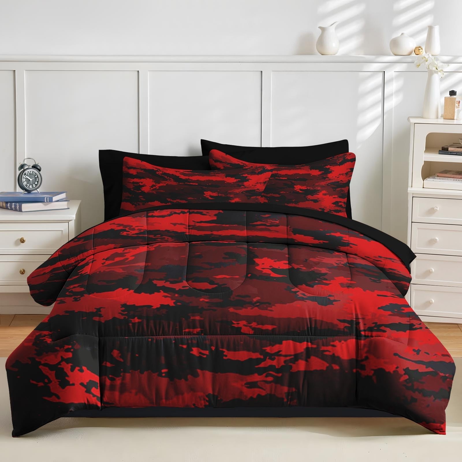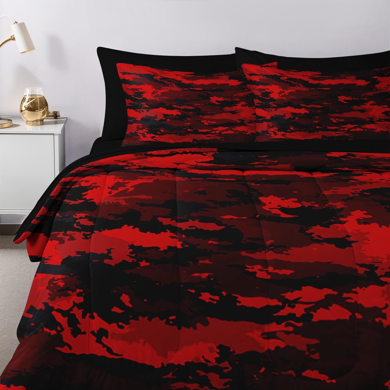 5 Pcs Comforter Set Twin Size, Red Black Camouflage Military Bedding Set for ...