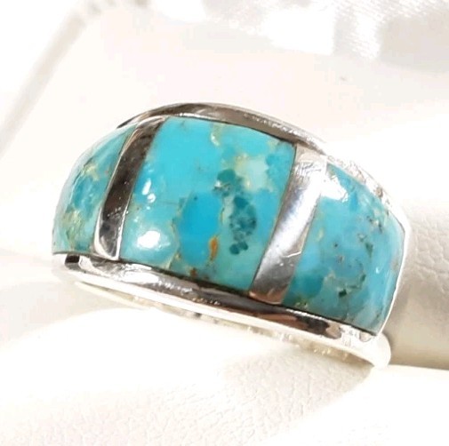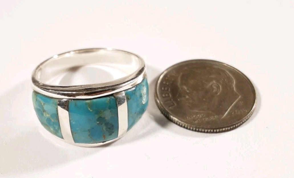 как выглядит 925 STERLING SILVER 3 STONES BAND TURQUOISE SIZE 9 RING 4.8g фото