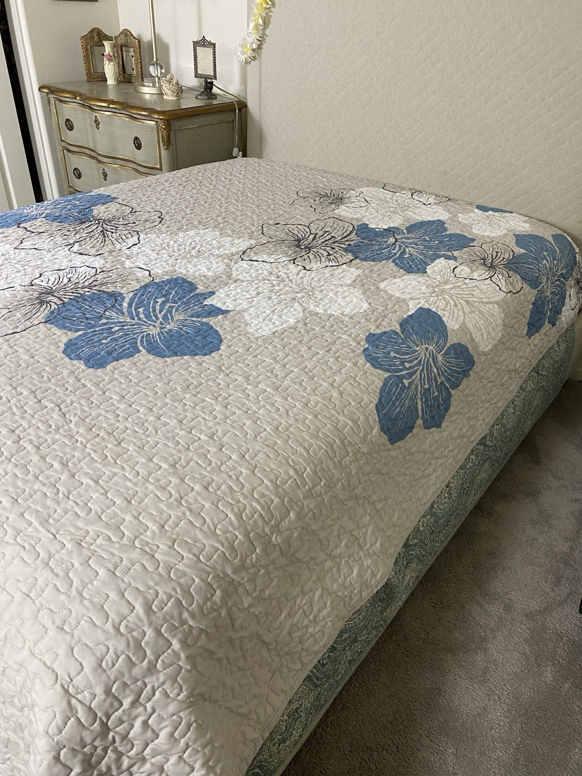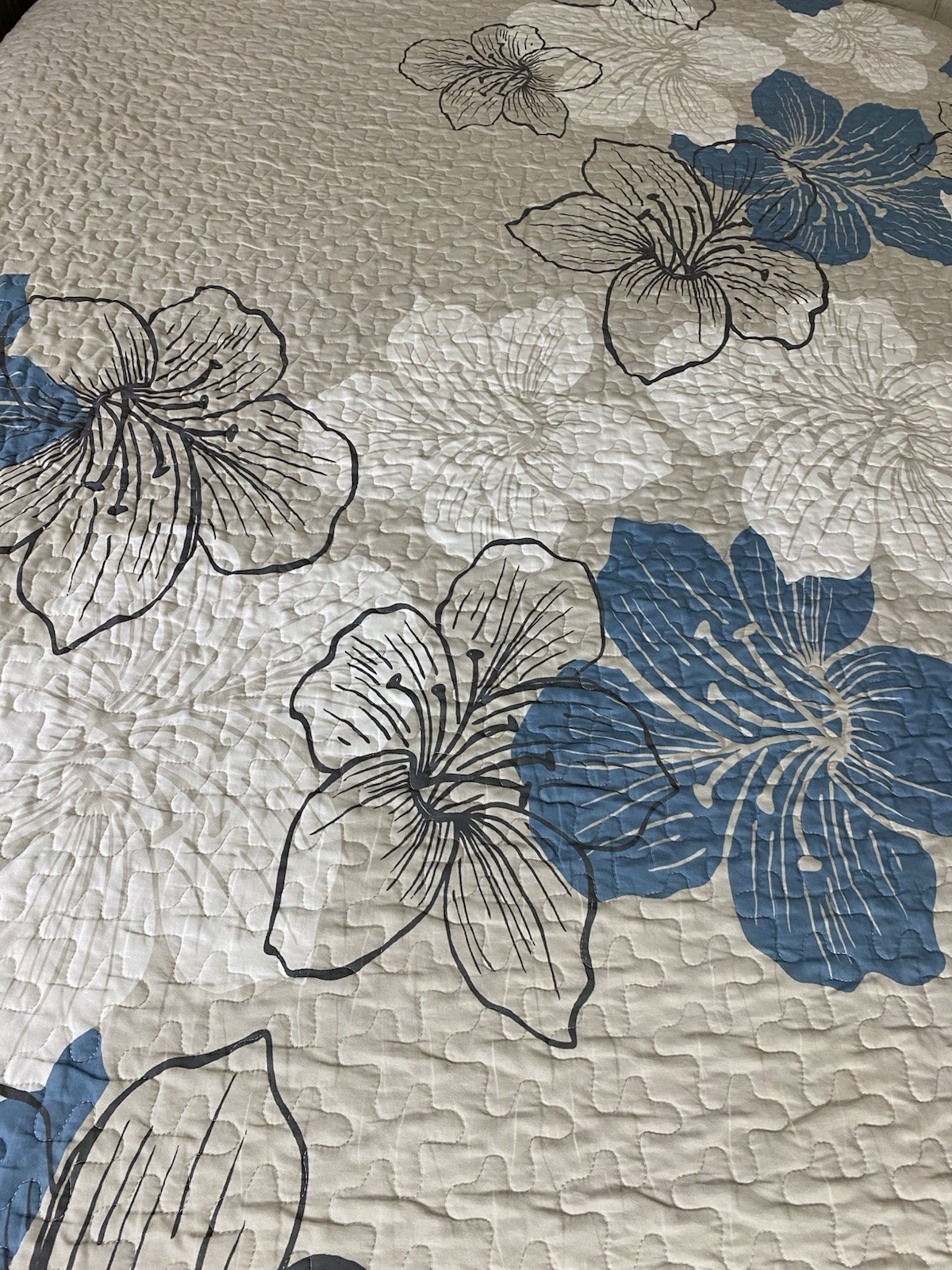 queen comforter Hawaiian Print Floral Gray Blue Wht Island Aloha