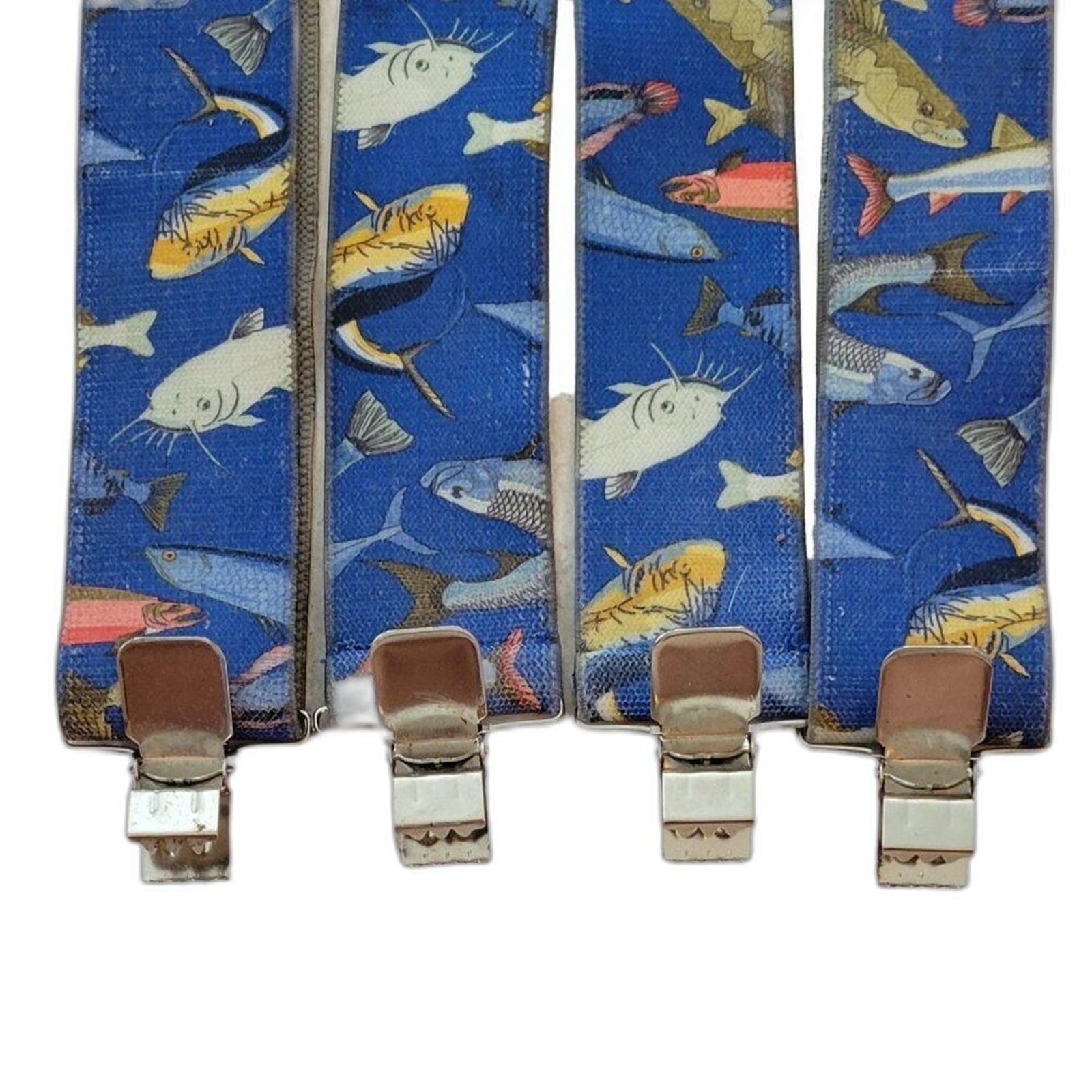 Men's Heavy Duty Suspenders Braces All Over Fish Print Blue Background USA