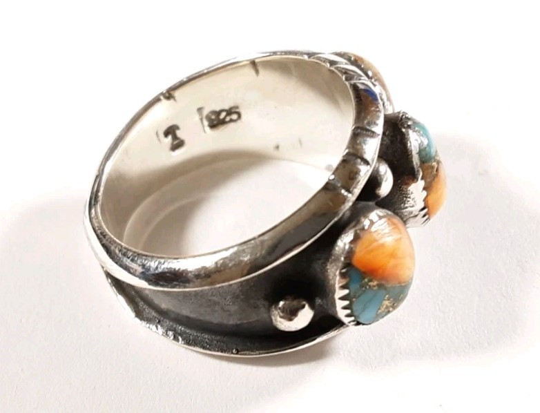 как выглядит 925 STERLING SILVER BEADED 3 STONES SPINY OYSTER TURQUOISE SIZE 11 RING 6.1g фото