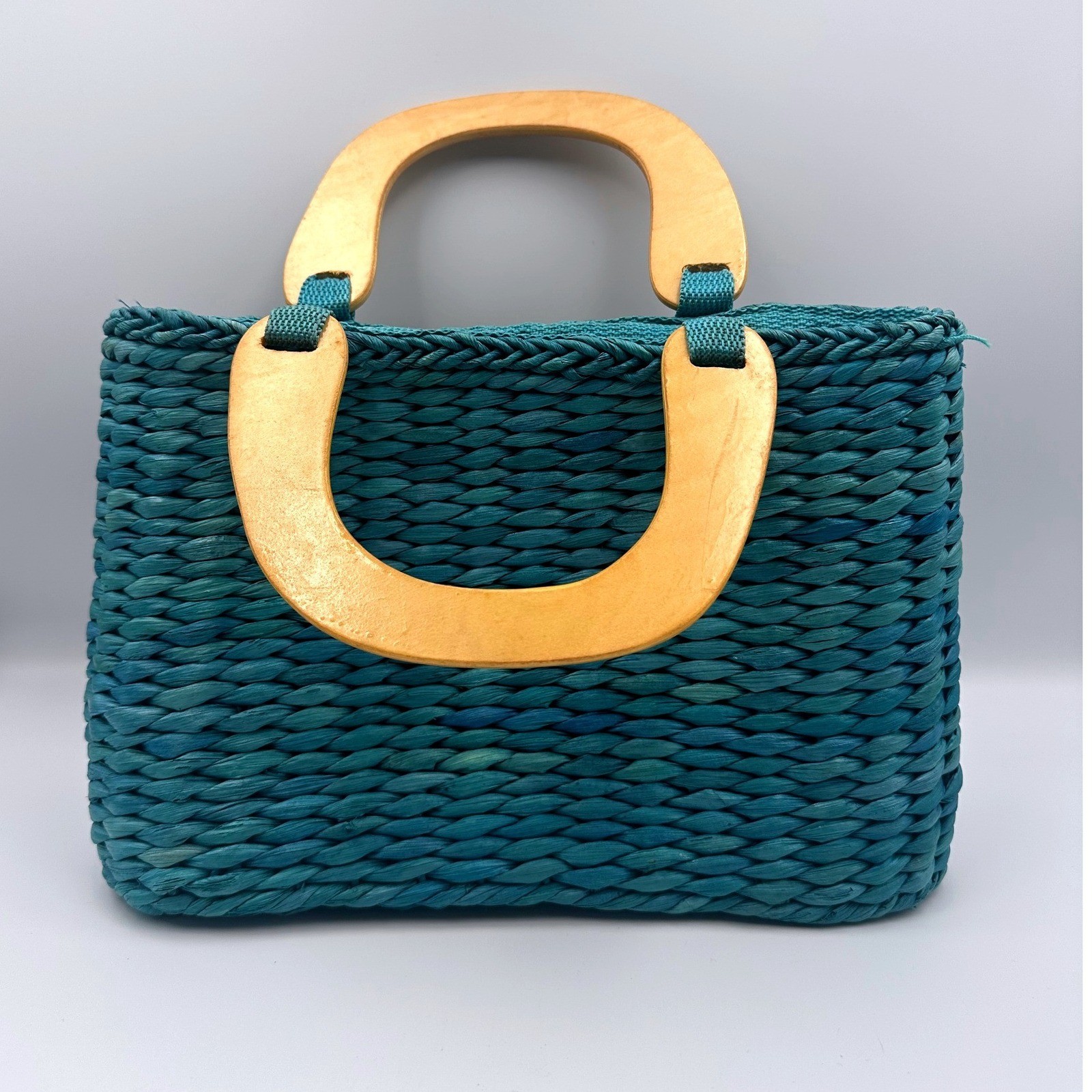 Vintage Teal Woven Straw Handbag Wood Handles Beaded Boho Purse