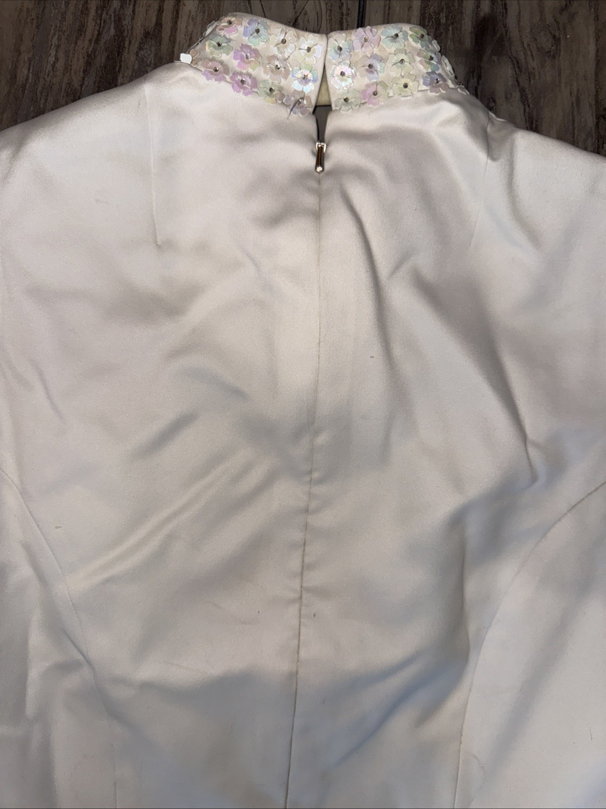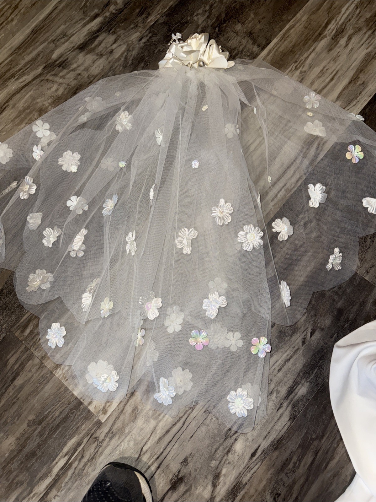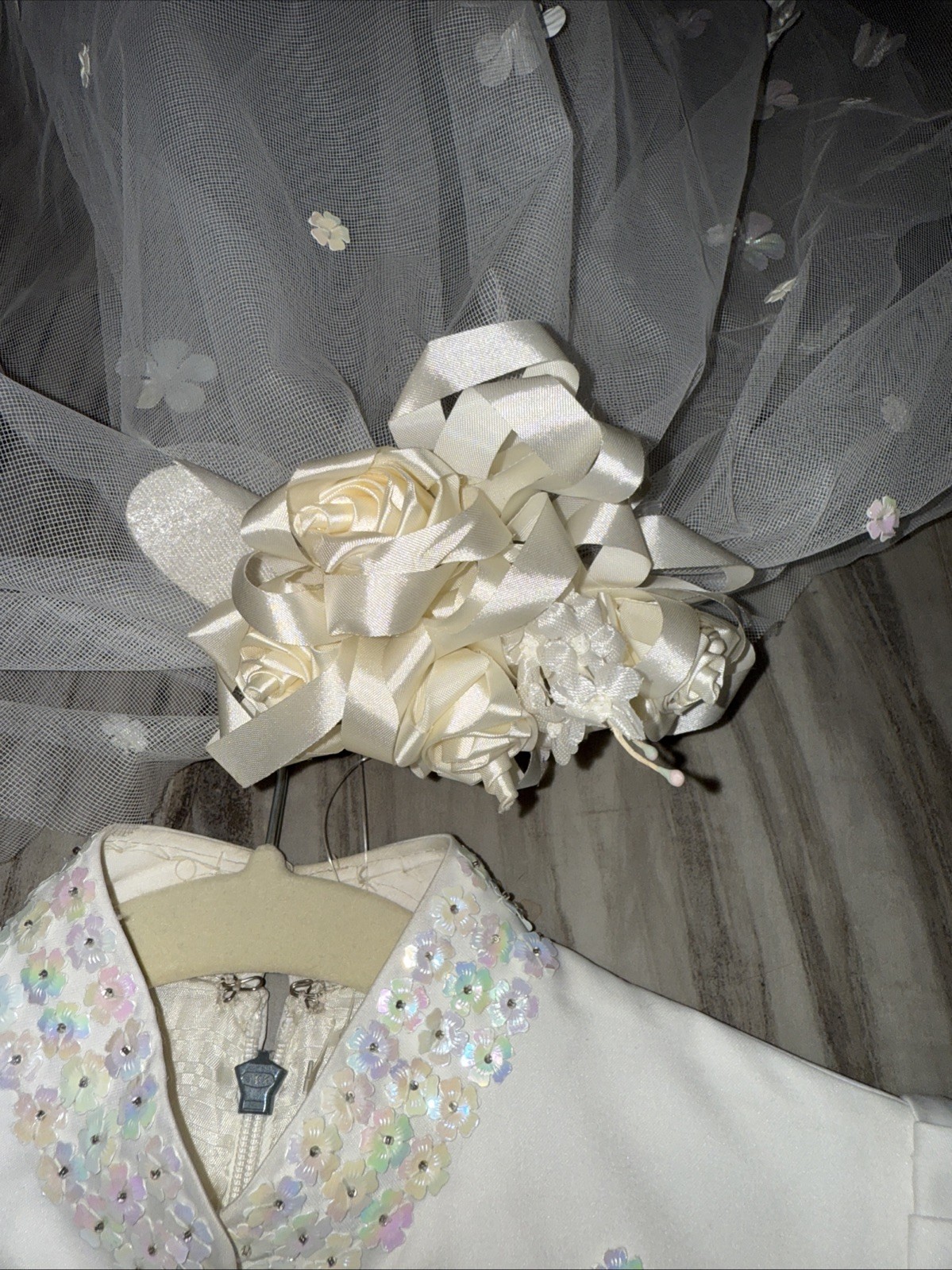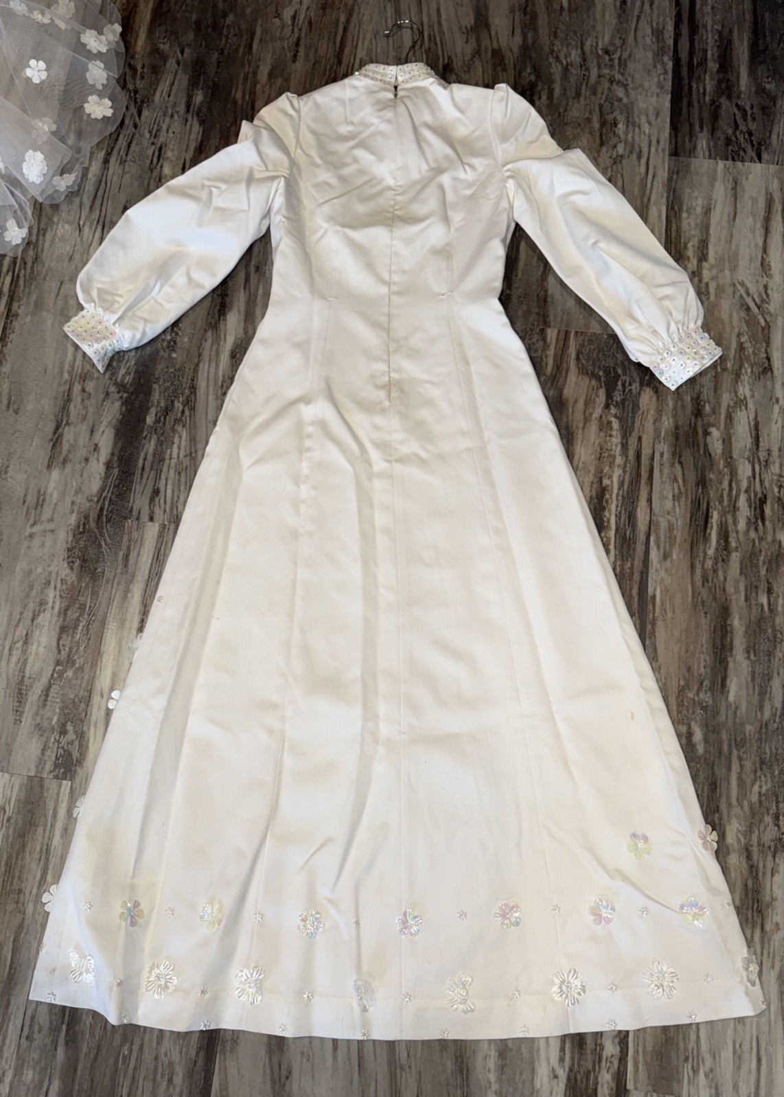 как выглядит VTG 70 s 80 s Bridal Satin Iridescent Flowers Long Sleeve Wedding Dress Veil фото