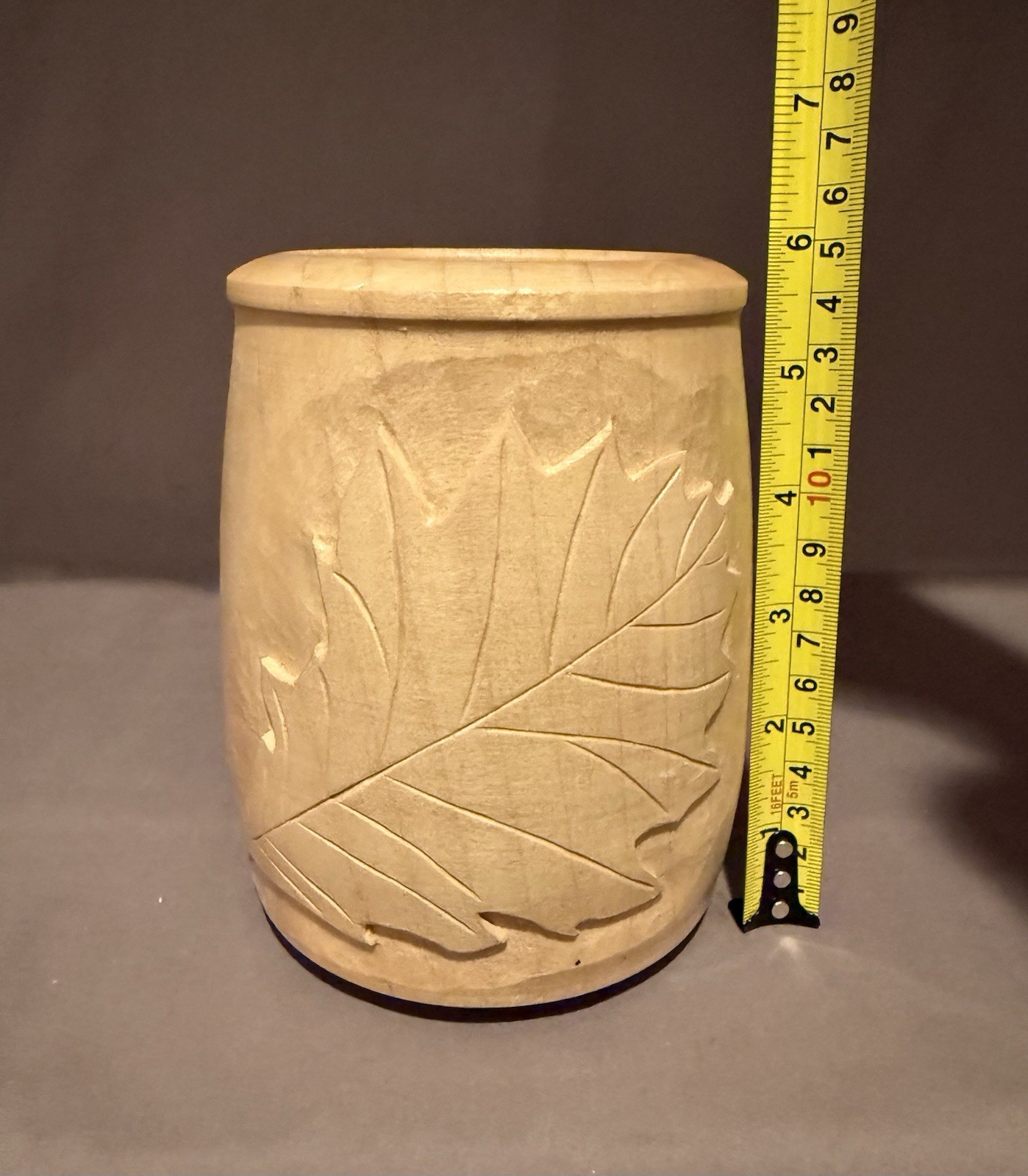 как выглядит HandCarved Wooden Vase W/ Leaf Design Carved Into Vase Folk Art Signed By Artist фото