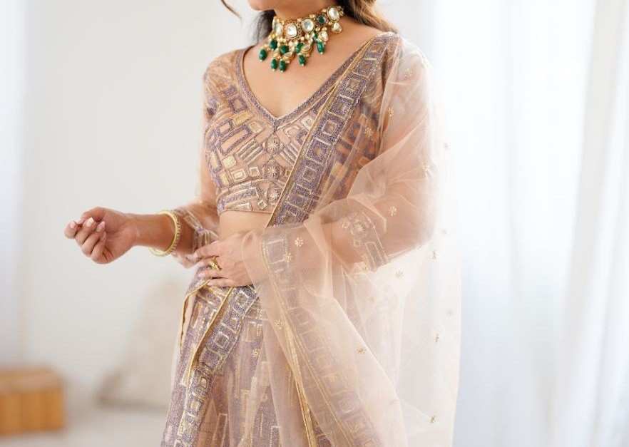 как выглядит New Designer Soft Butterfly Net Beige Lehenga Choli With Dupatta For Wedding фото