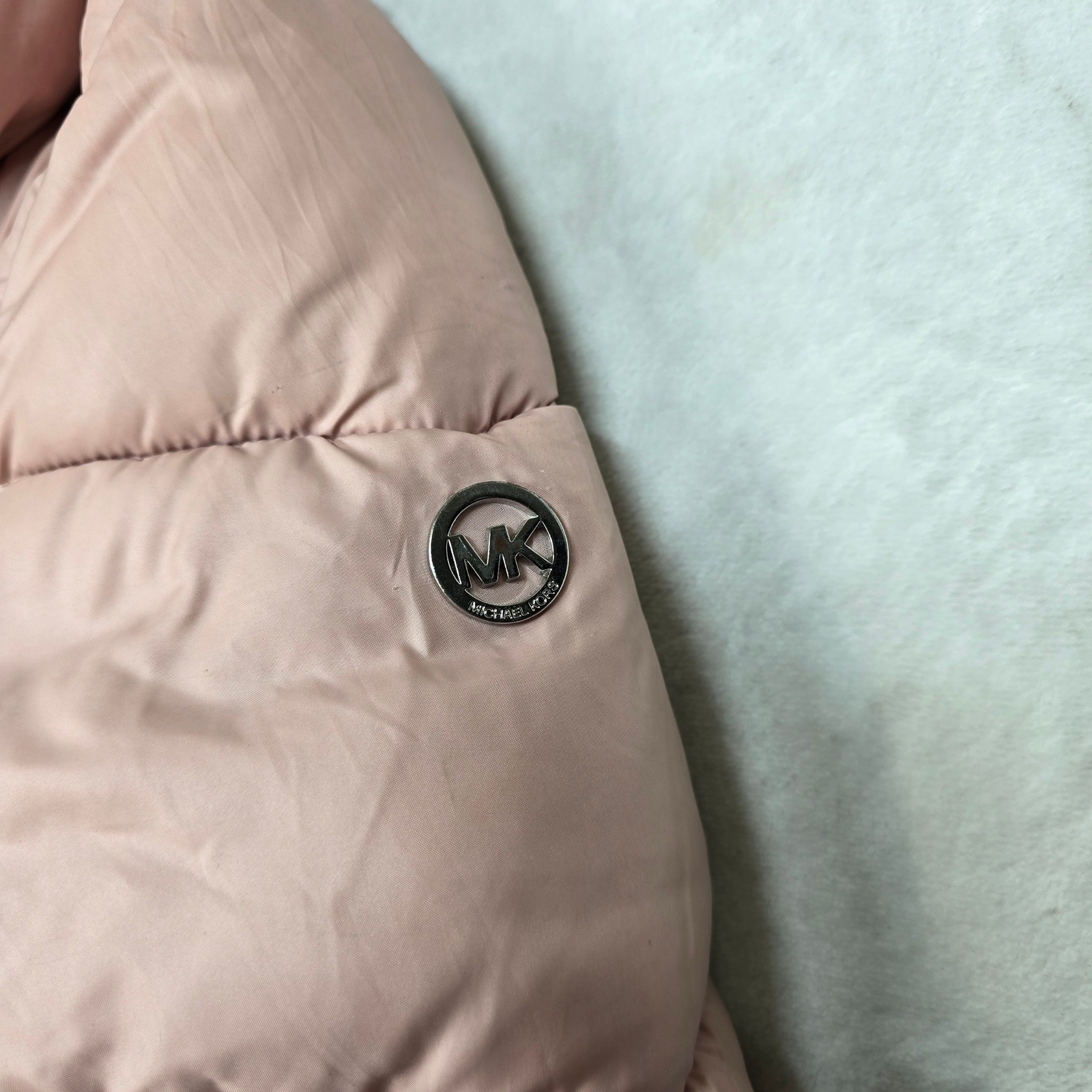 как выглядит Michael Kors Puffer Jacket Kids Girls 10 12 Pink Hooded Faux Fur Lined фото