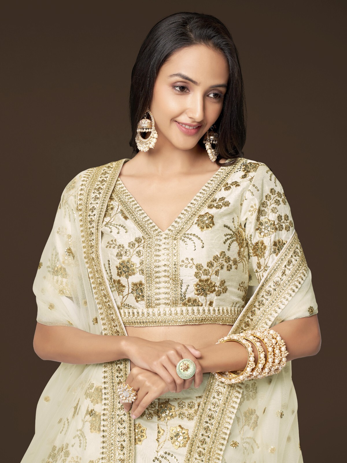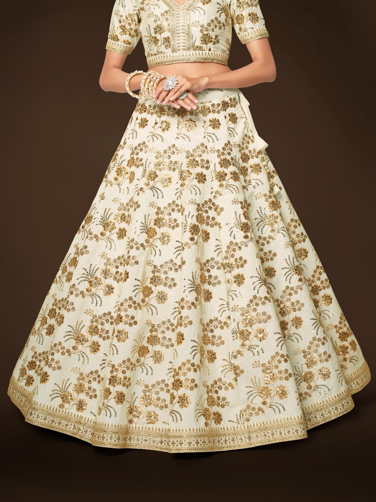 Indian Designer Slub Silk White Lehenga Choli With Dupatta For Wedding