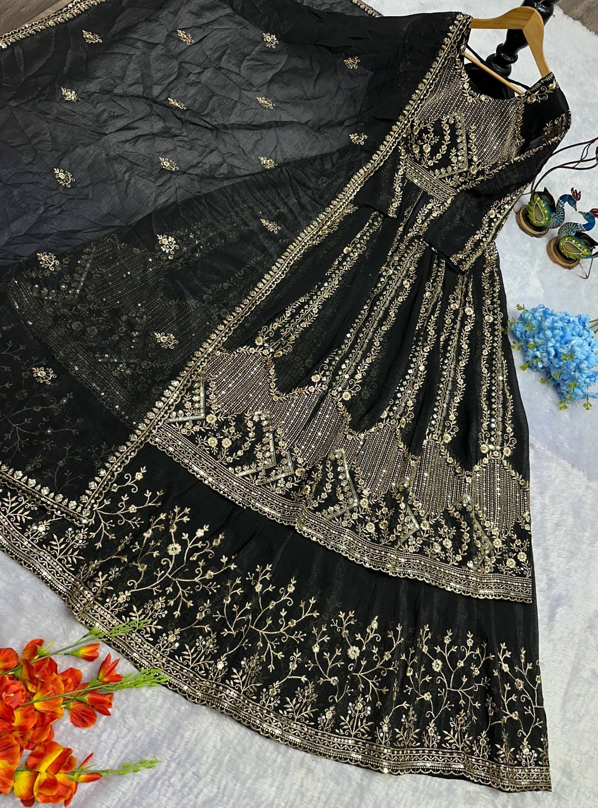 Fancy Designer Crunchy Silk Black Top Lehenga With Dupatta For Reception