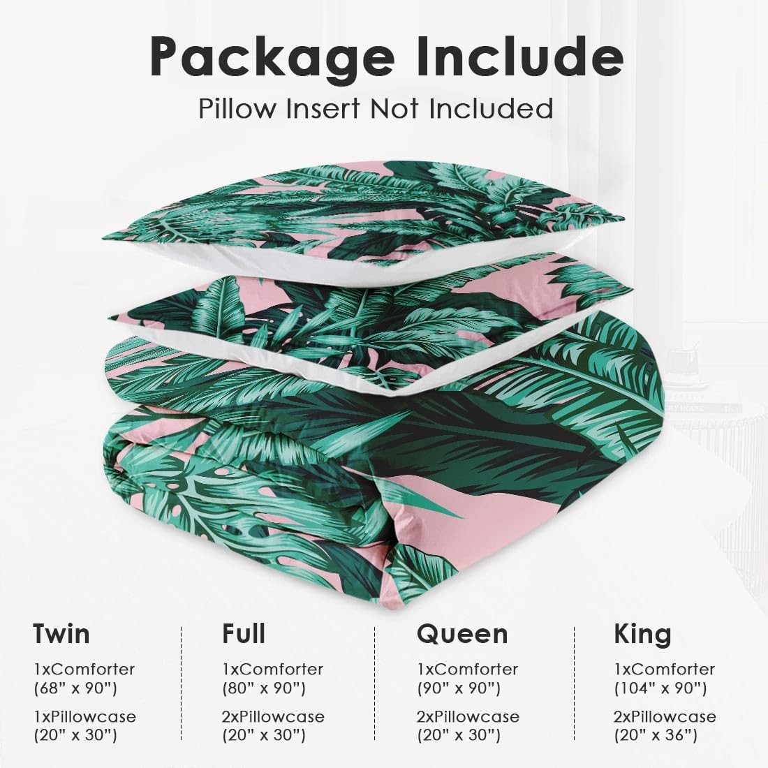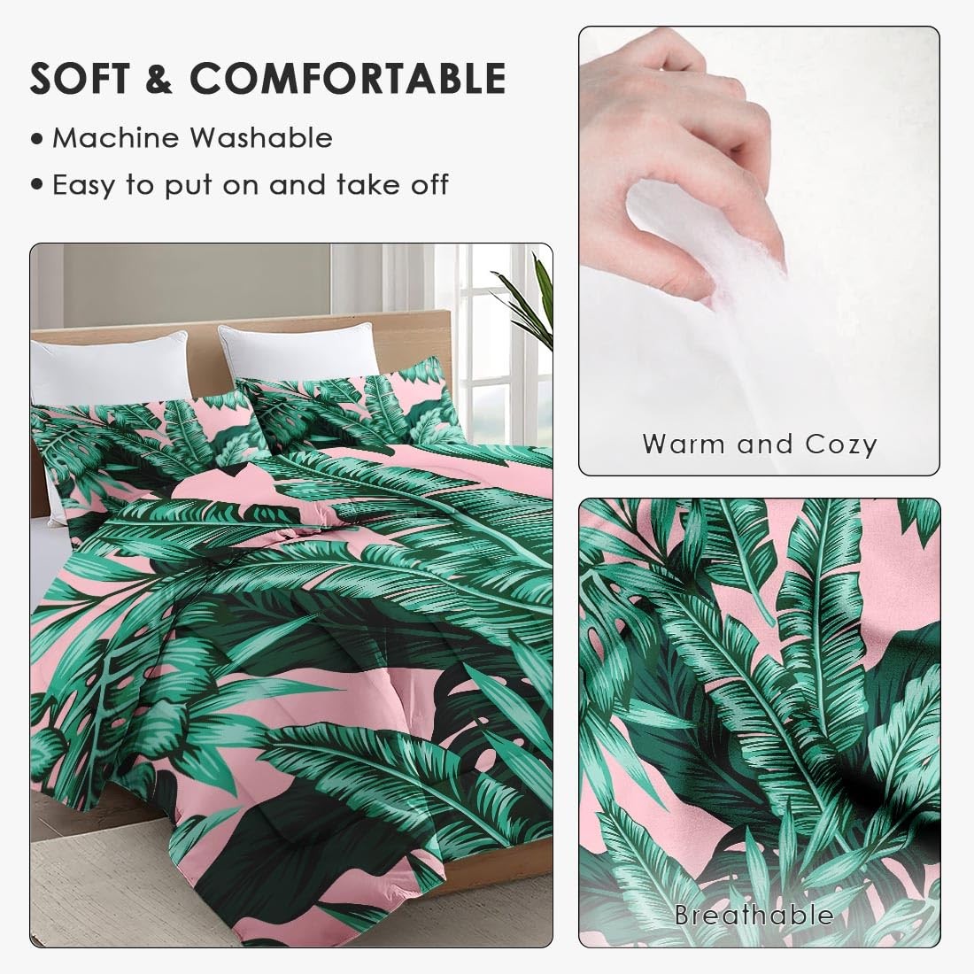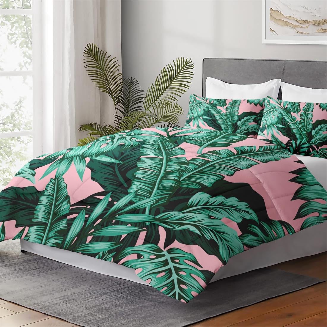 Full Size Comforter Set with 2 Pillowcases, Tropical Green Leaves Pink Leaf S...