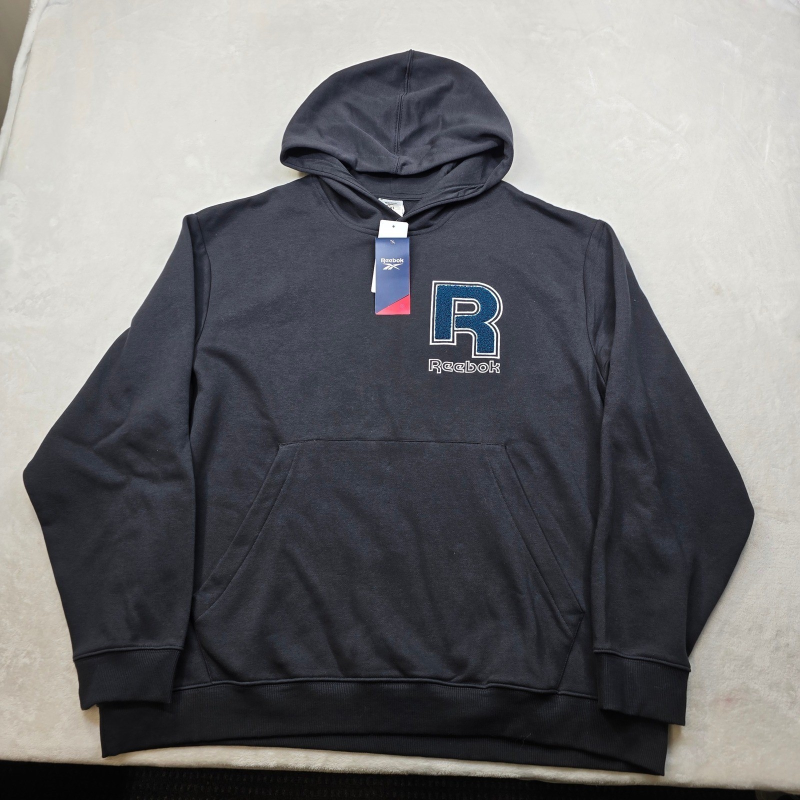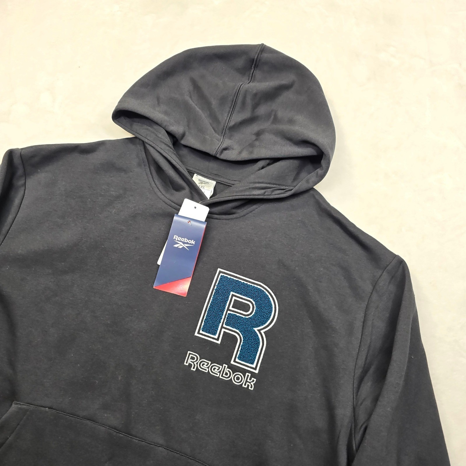 Reebok Chenille 'R' Logo Hoodie Men's 2XL Black Athletic Casual Sweatshirt NEW