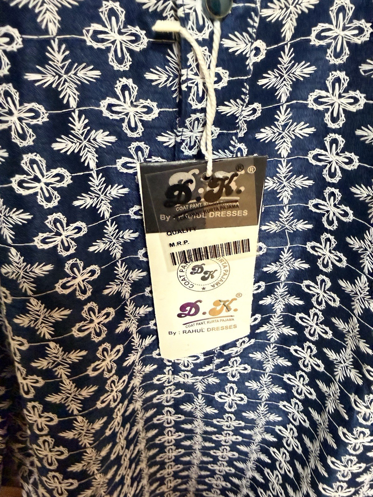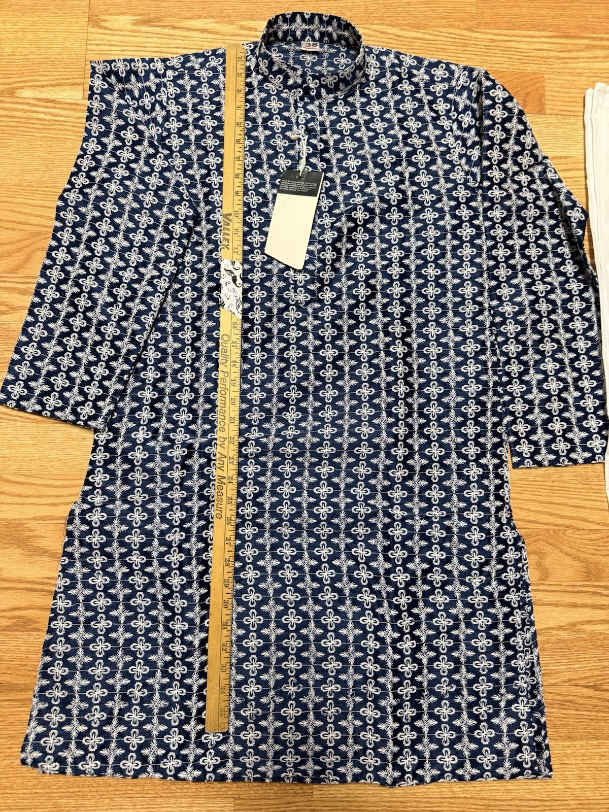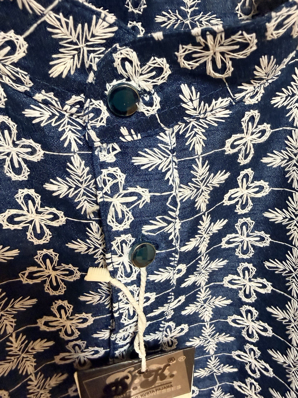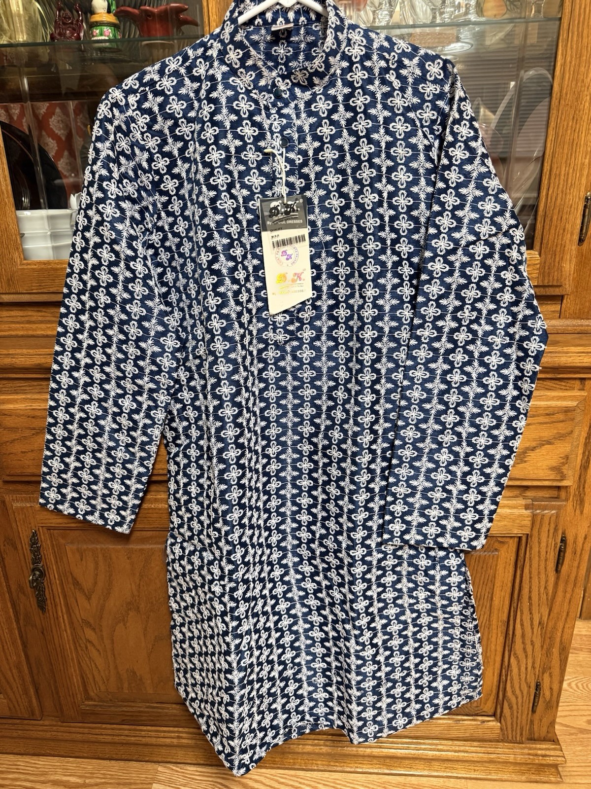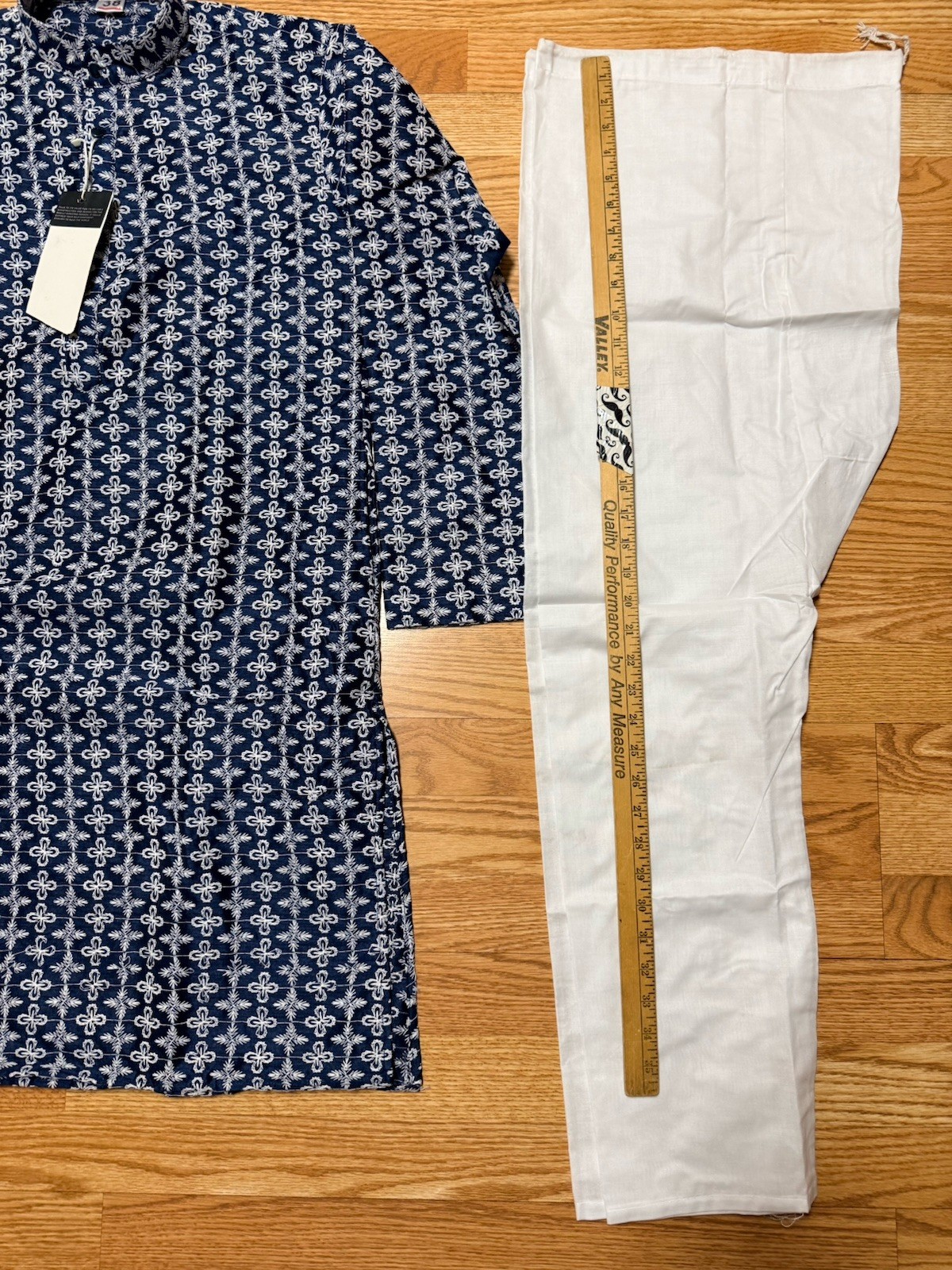 NWT Men's Kurta PAJAMA SET SZ 38 S/M Art silk NAVY WHITE EMBROIDERY India-USA