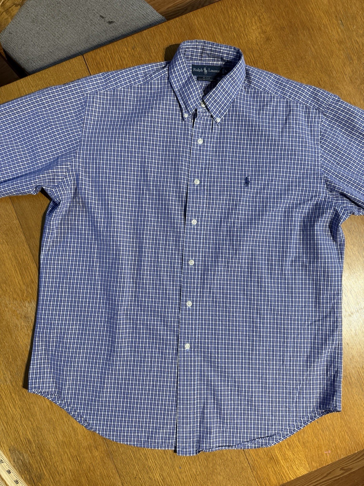 как выглядит VTG Polo Ralph Lauren Shirt Mens L Blue White Gingham Check Oxford S/S Blue Pony фото