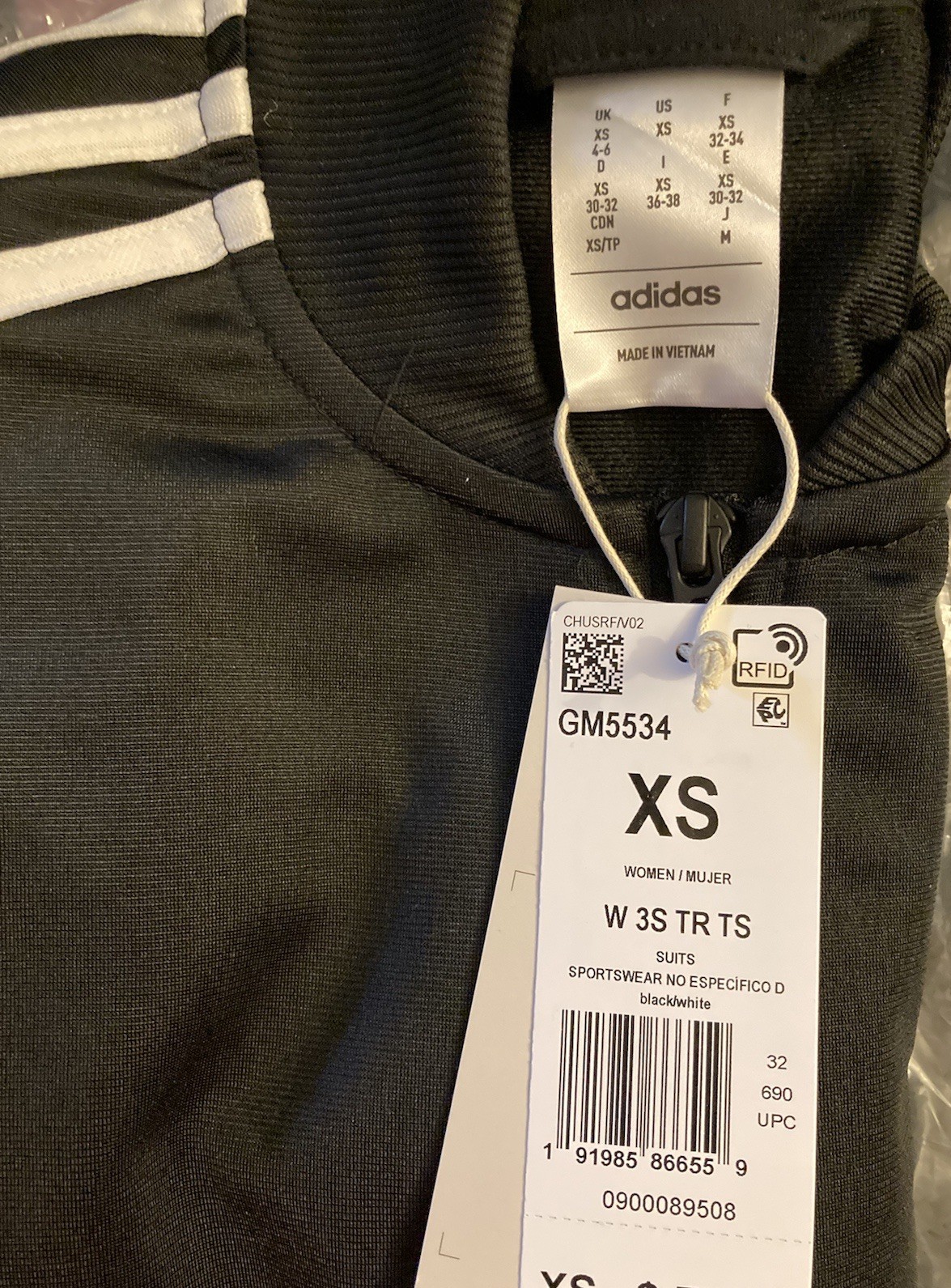 Womens NEW ADIDAS Tricot 3-Stripes Black Track Suit Zip Front Closure Size XS