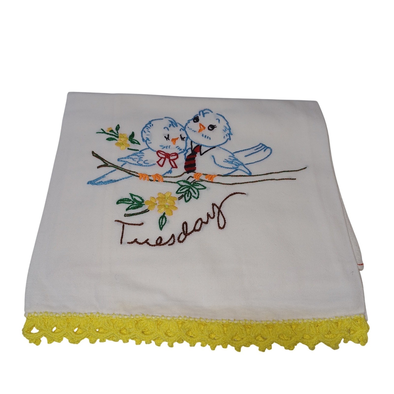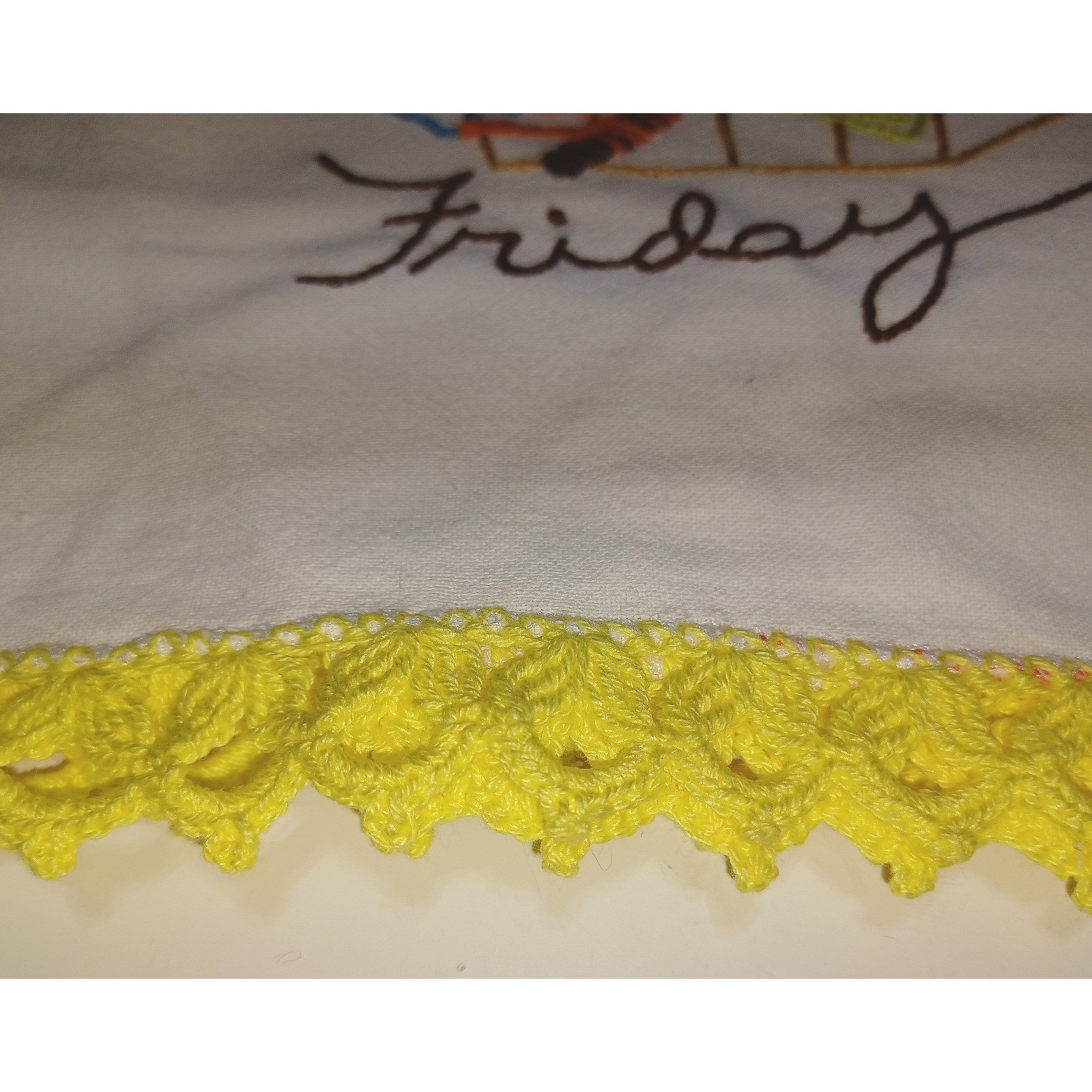 VTG Embroidered Bird Kitchen Cotton Tea Towels 7 Days/Week Yellow Crochet Trim