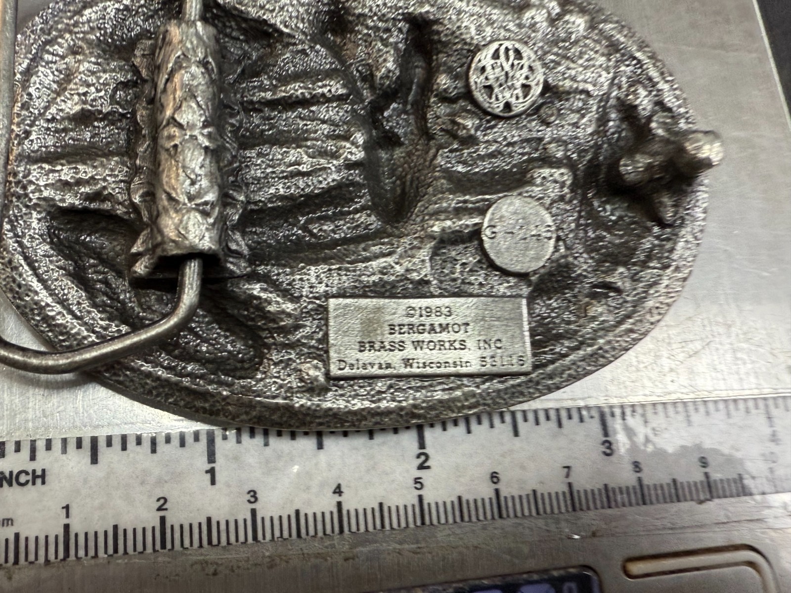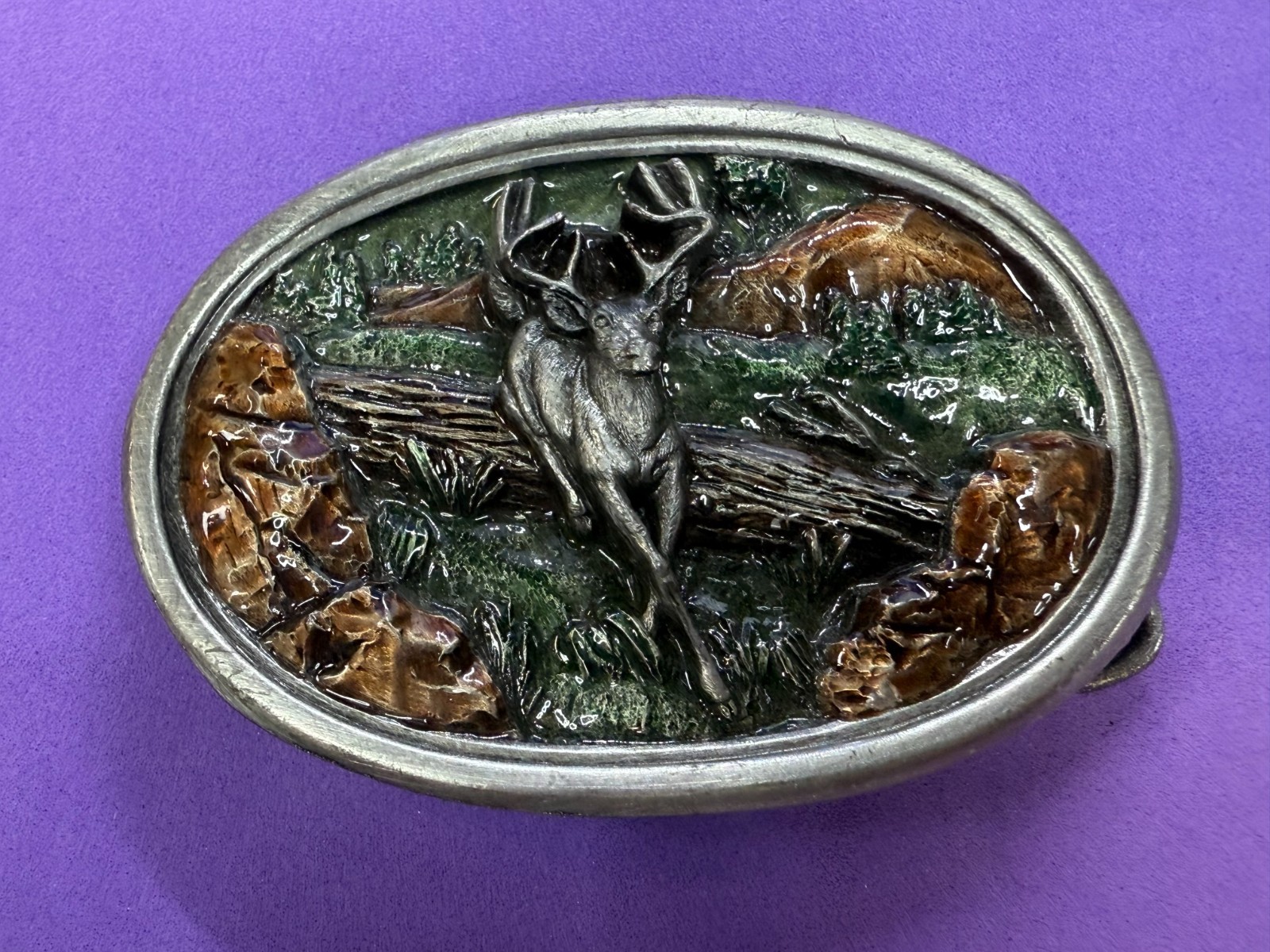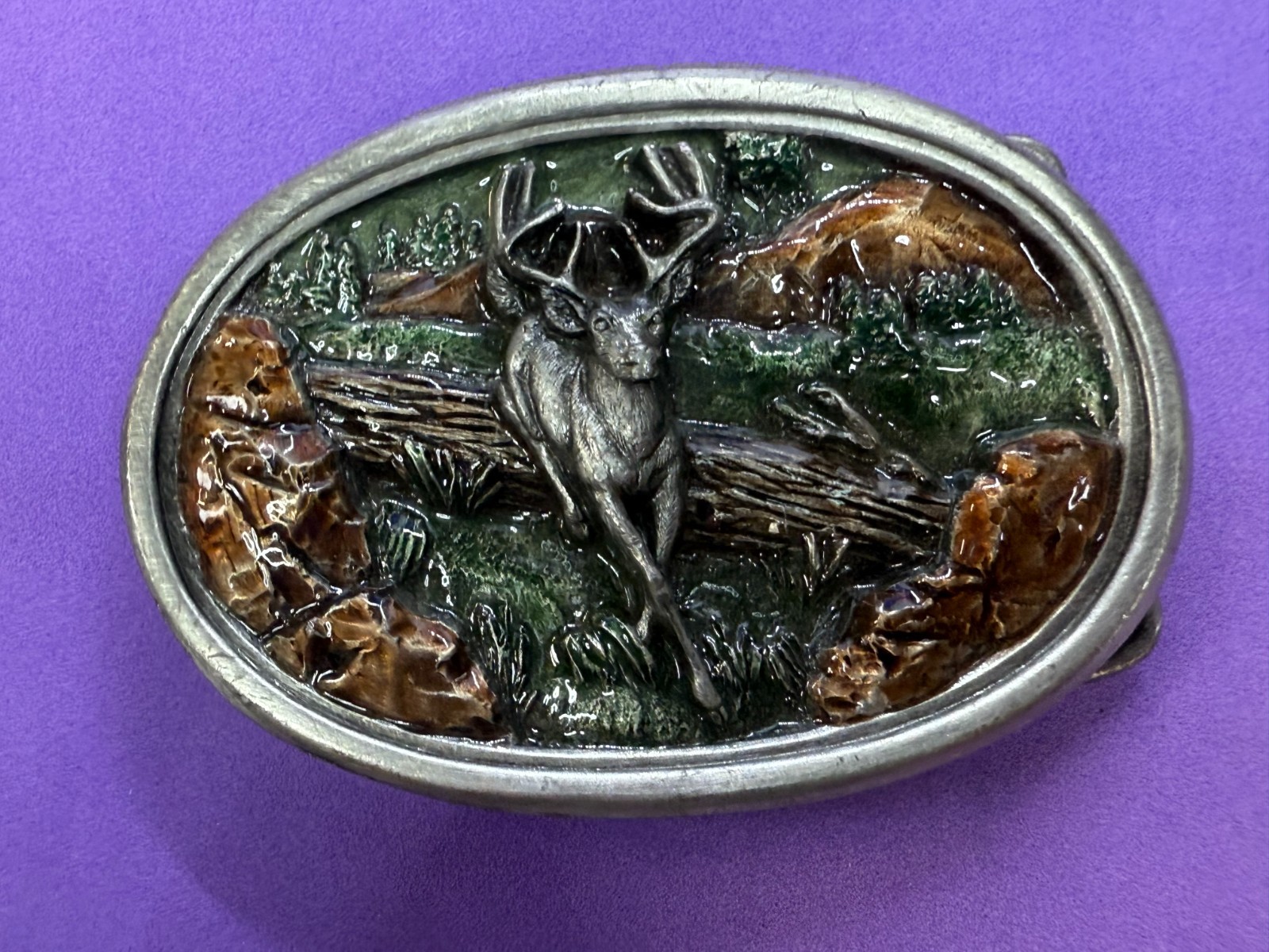 Jumping Deer Over the Log Wildlife Hunting Hunters Vtg 1983 Bergamot Belt Buckle