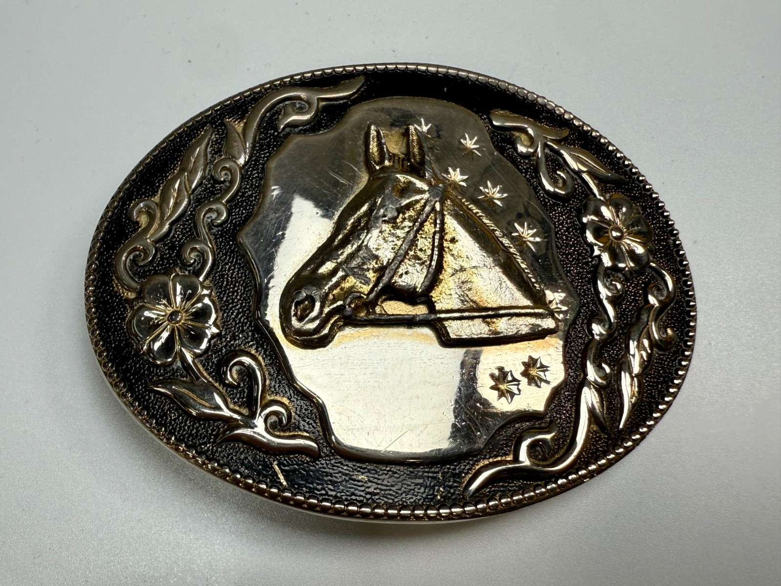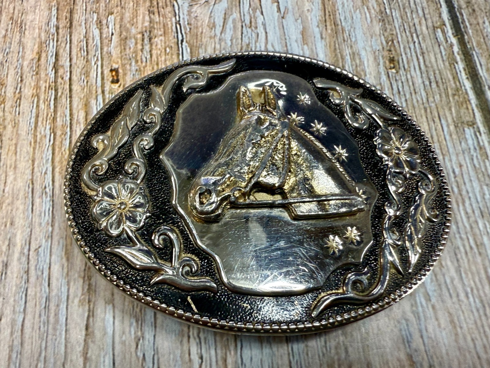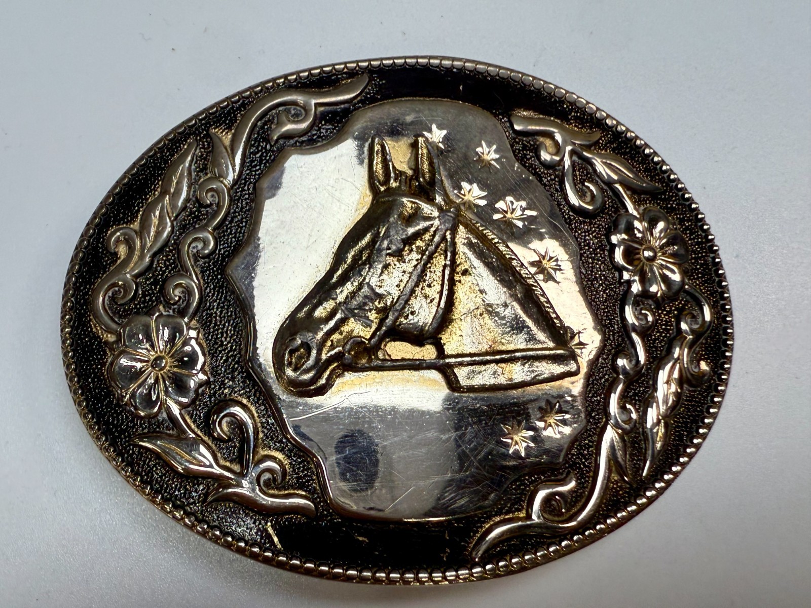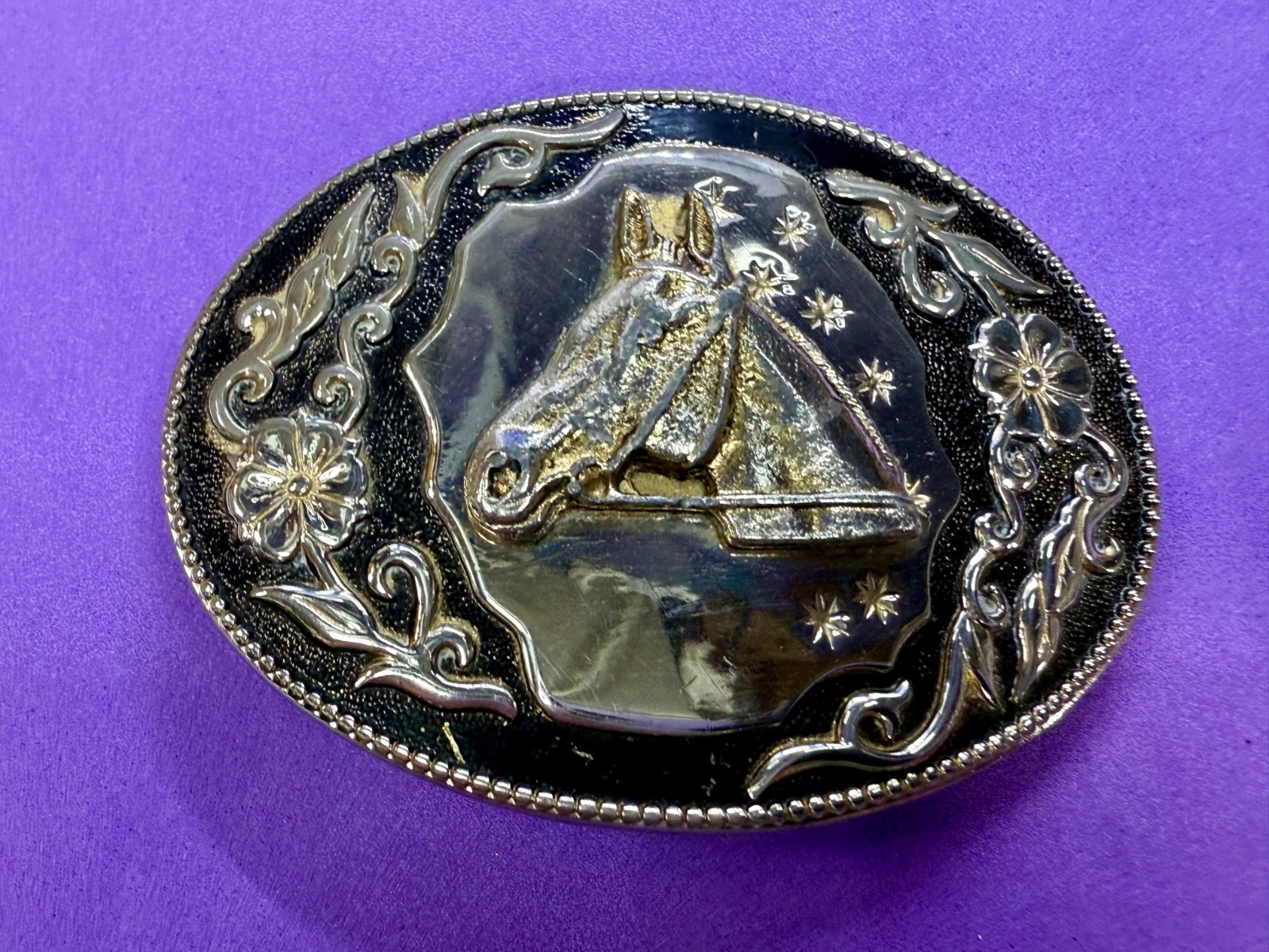 Horse Head Flower Swirl Ornate Western Rodeo Cowboy Gold Color Belt Buckle