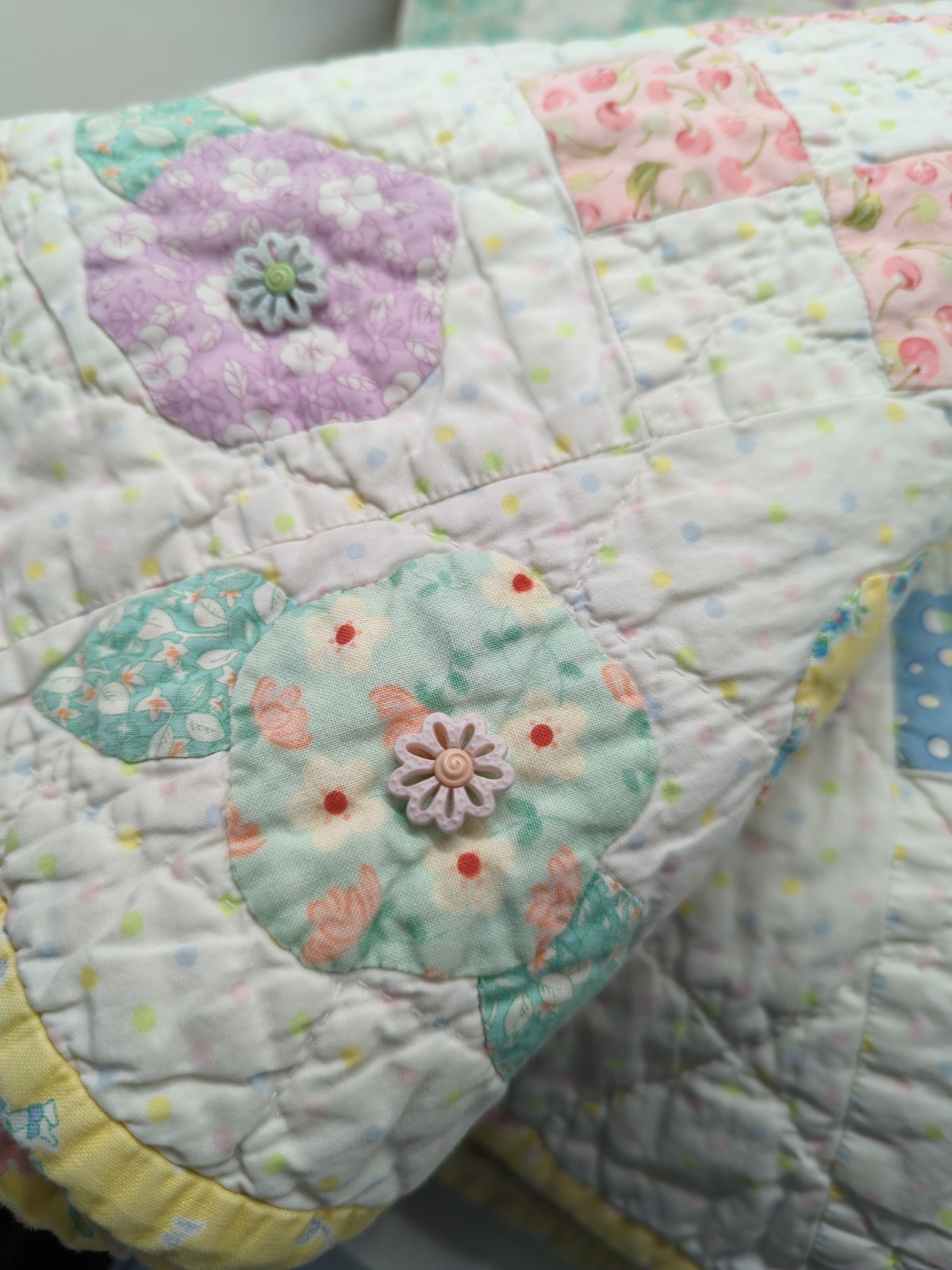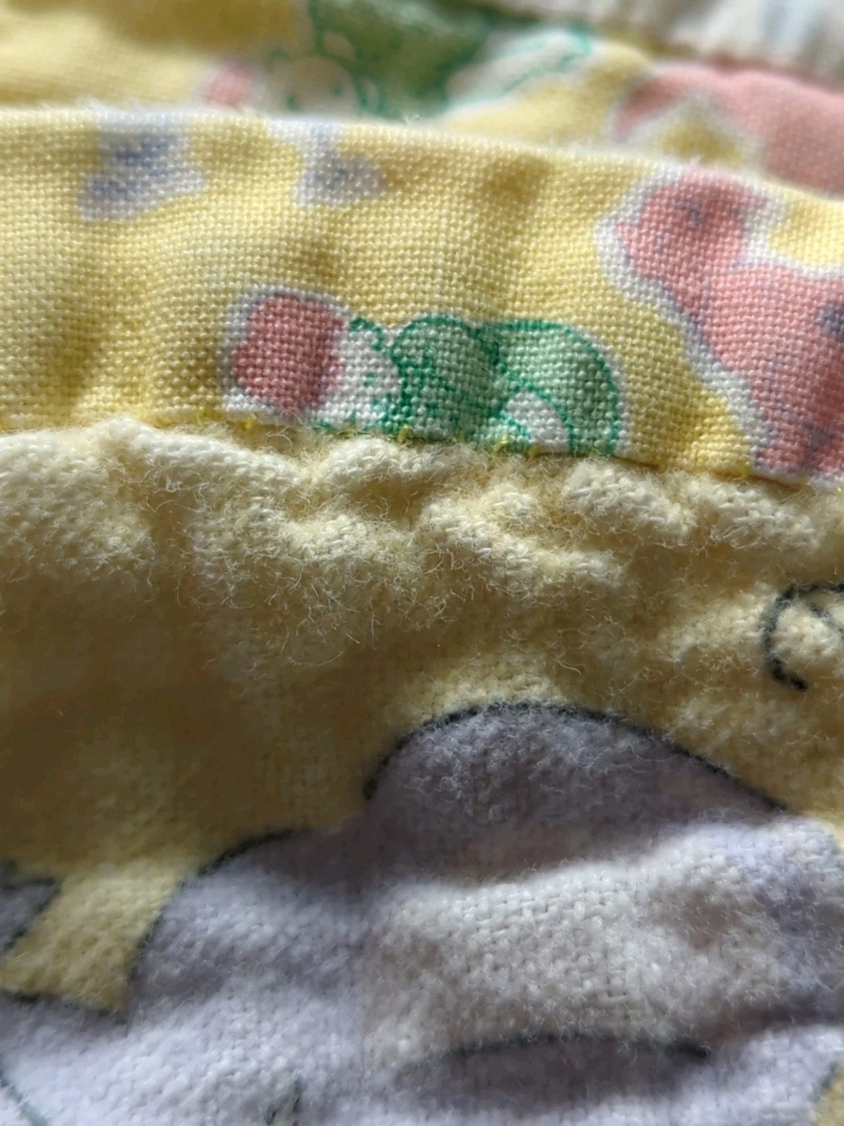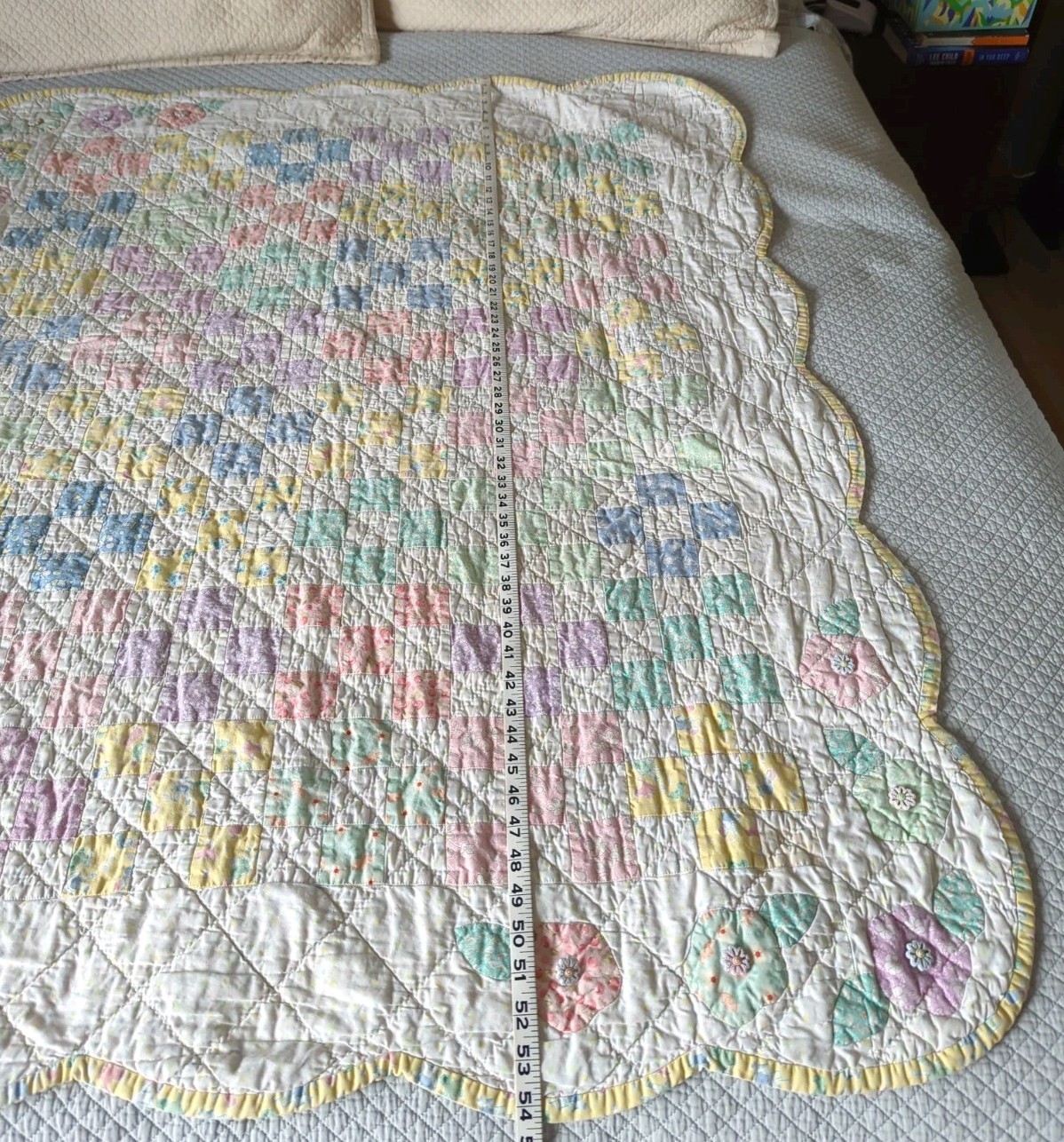 VTG Hand Quilted Baby Blanket Scalloped Edge Patchwork Front Yellow Flannel Back