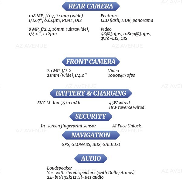 Особенности: Accelerometer, Ambient Light Sensor, AMOLED Display, Bluetooth Enabled, Dual Rear Cameras, E-compass, Email, Web, Facial Recognition, Fast Charging, Fingerprint Sensor, Front Camera, Global Ready, GPS, High Capacity Battery (5000 mAh or More), Internet Connectivity, Proximity Sensor, Touch Screen, Ultra Wide-Angle Camera, Video Calling, Video Camera, Wide-Angle Camera, Wi-Fi Capable, Colour Screen, Gyroscope
