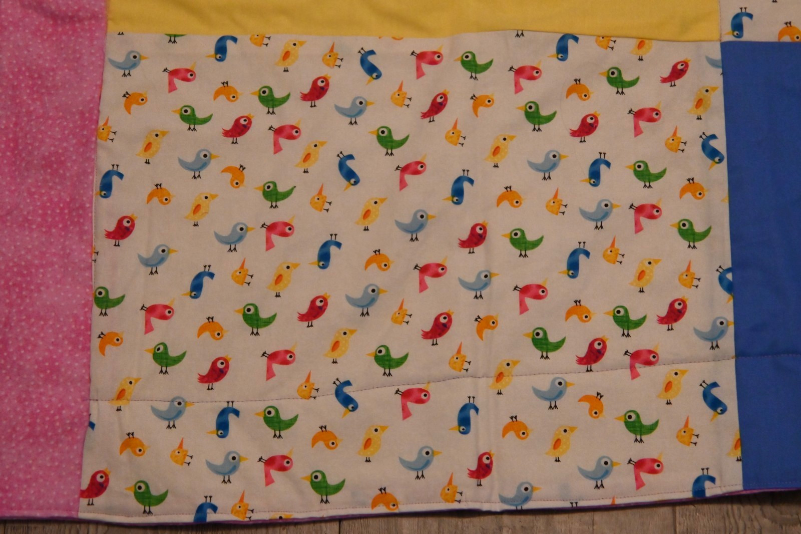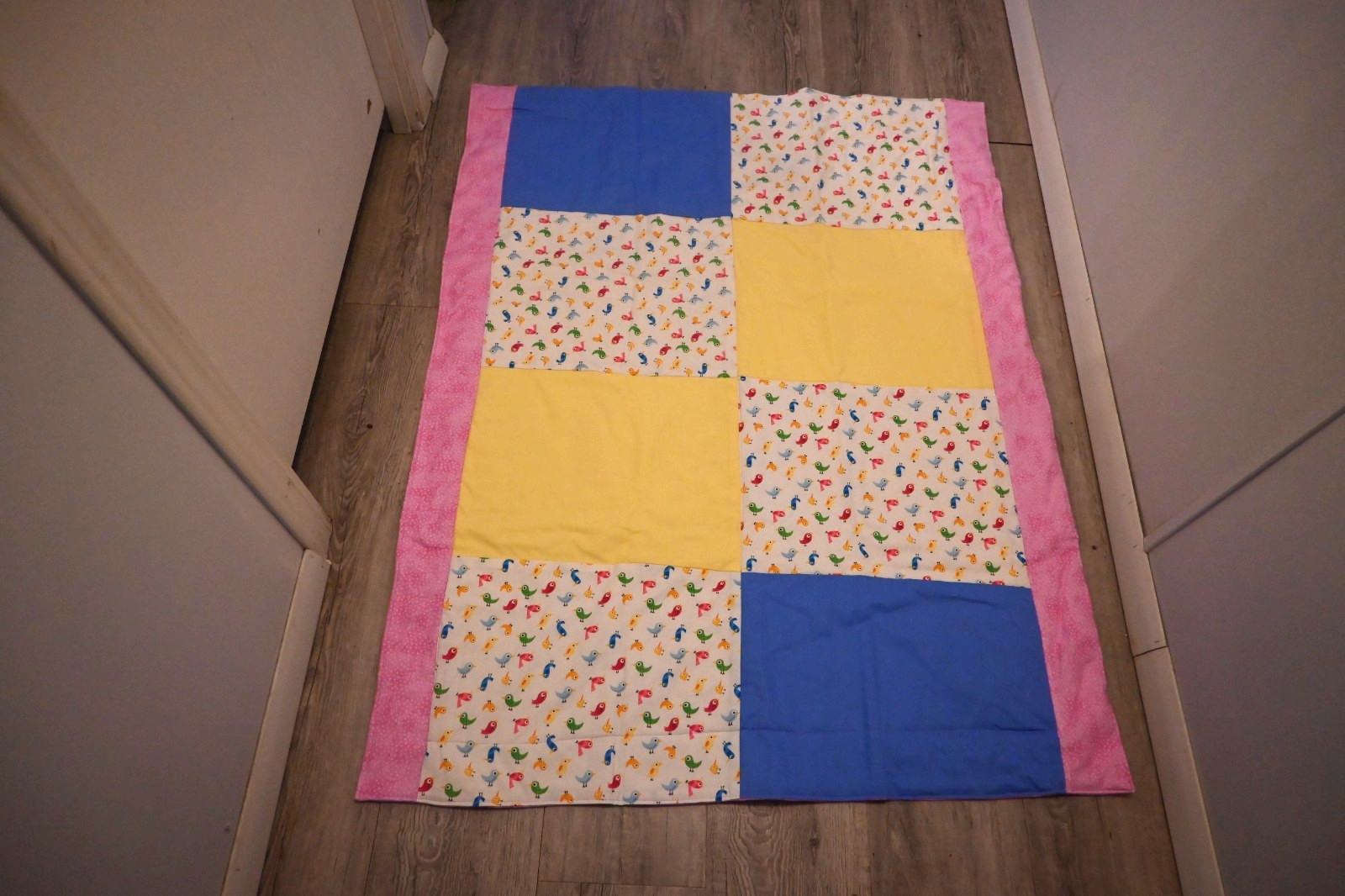 Handmade baby quilt or lap quilt in pink backing and pattern squares 46 x36 in