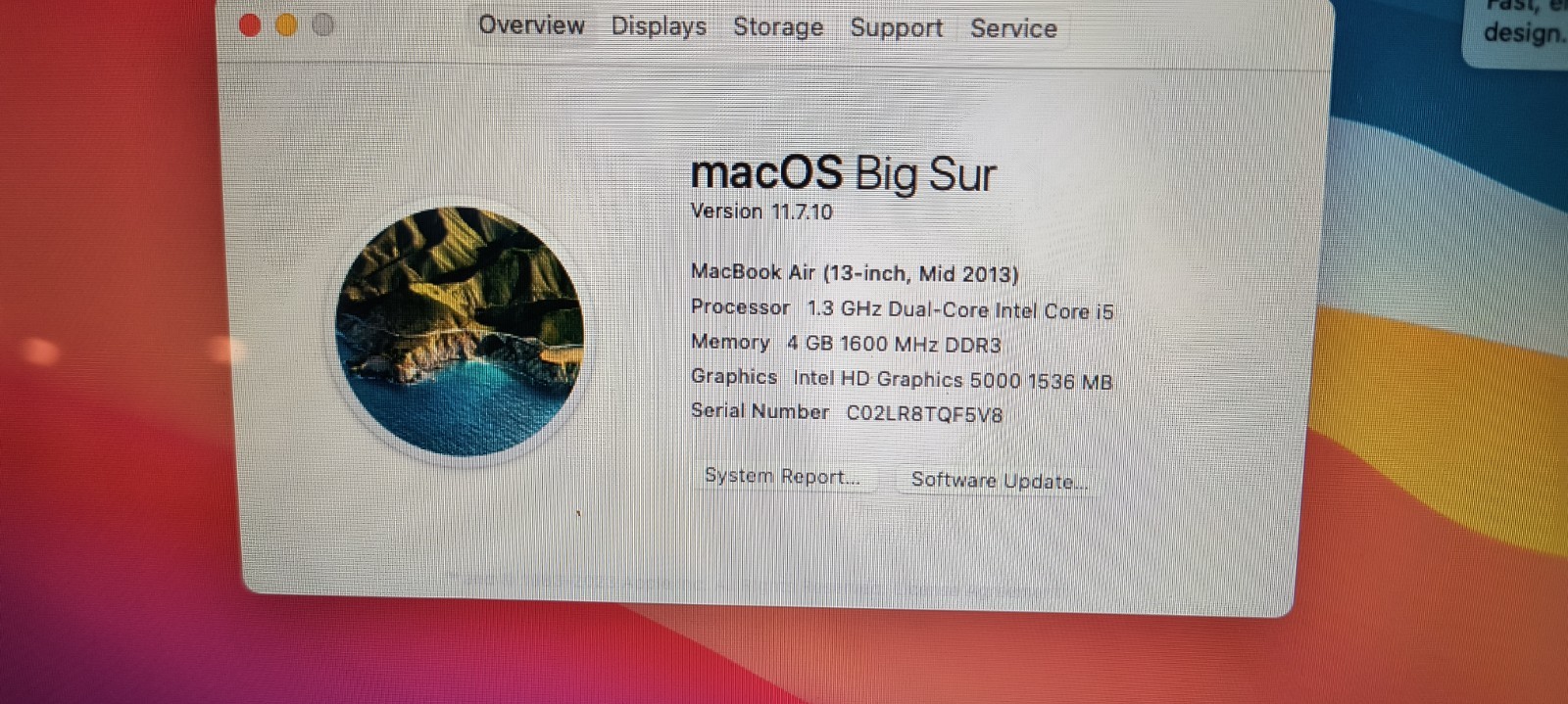 Apple MacBook Air 13 Mid 2013 i5 1.3GHz 4GB RAM 256GB SSD macOS Big Sur