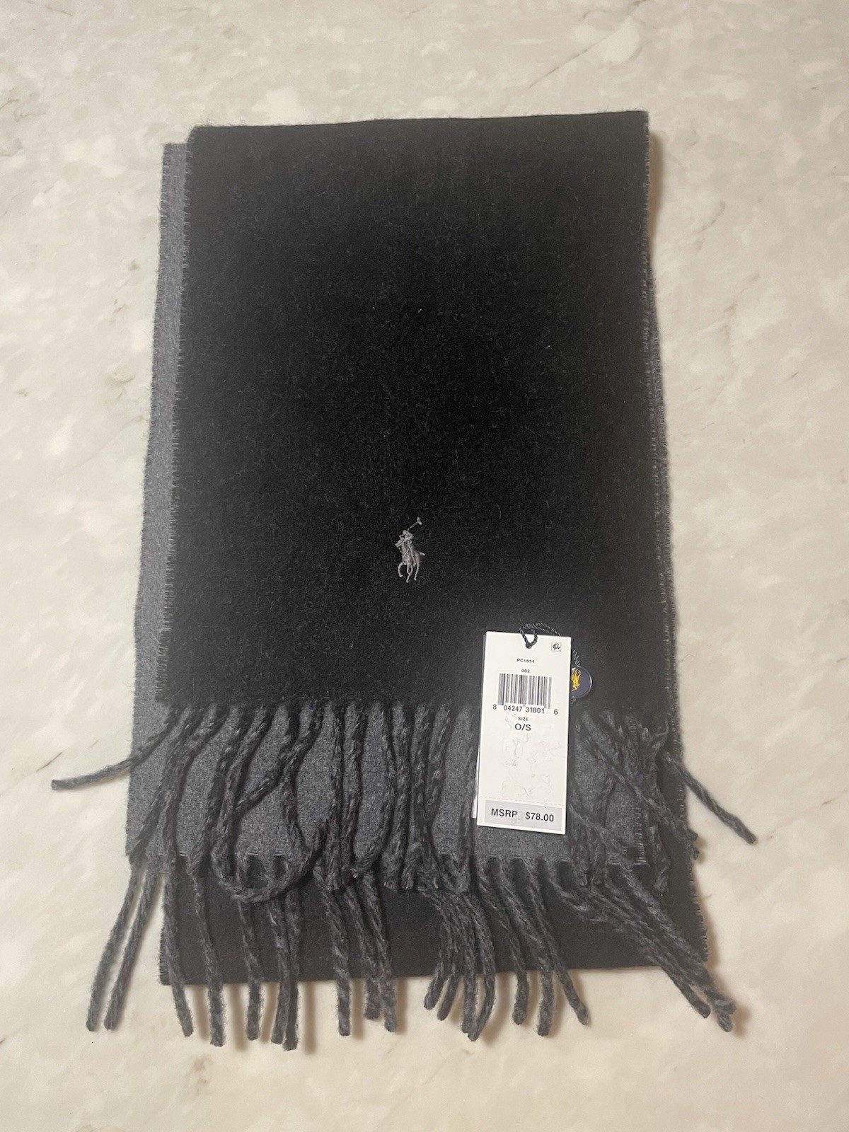 как выглядит Polo Ralph Lauren Black Gray Reversible Wool Blend Fringed Scarf Made Italy NWT фото