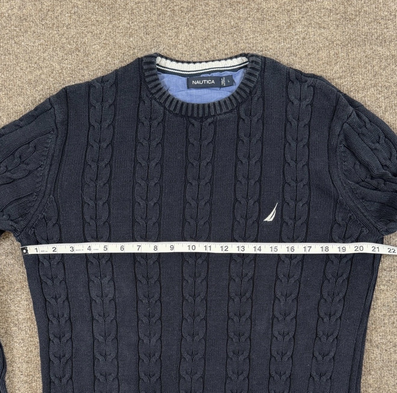 Nautica Navy Blue Cable-knit Crewneck Pullover Sweater Mens L 100 Cotton Preppy