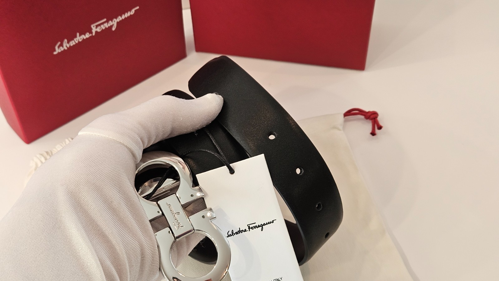 как выглядит Ferragamo Mens Belt Size 85-90-100-105 Black Leather Silver Buckle W/BOX фото