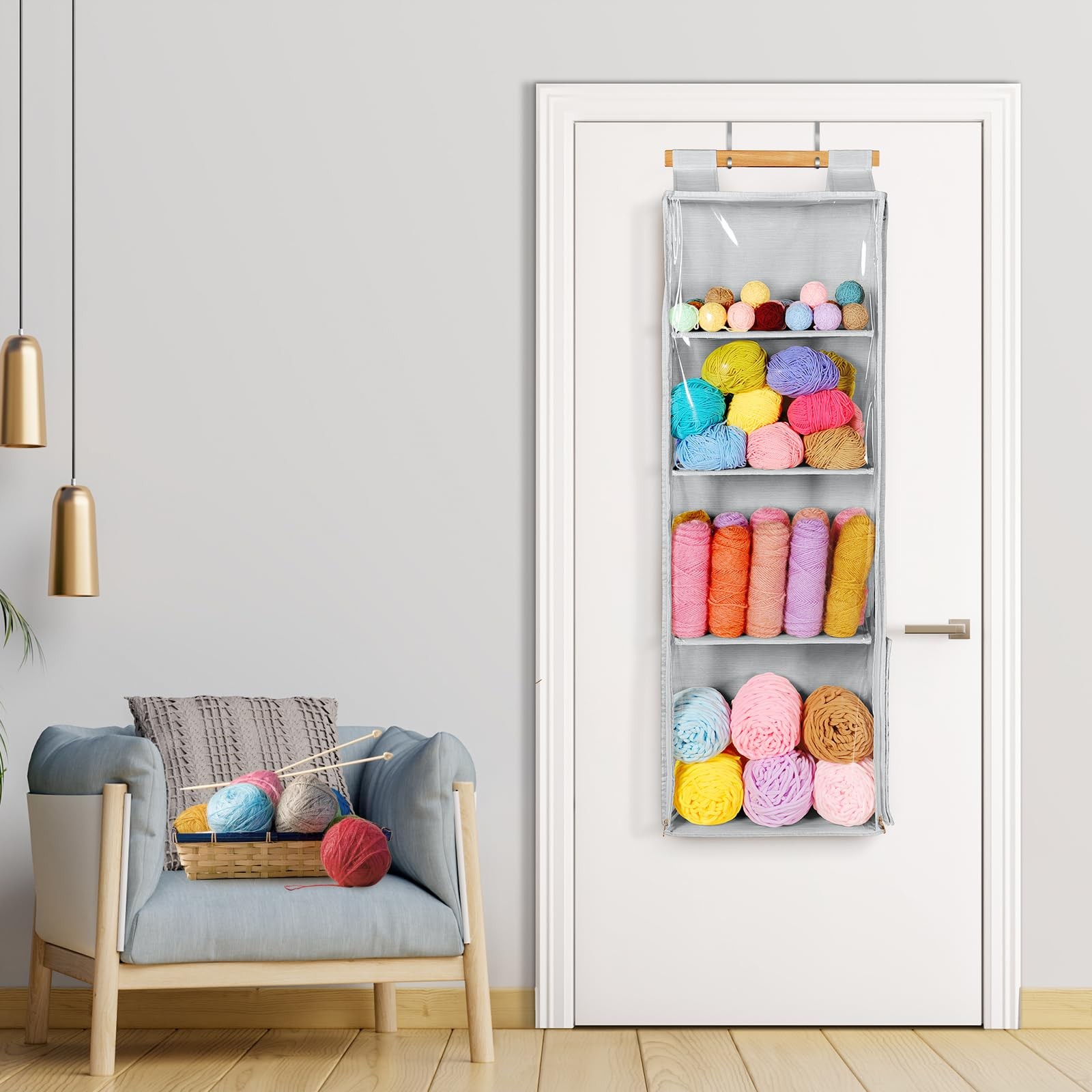 как выглядит Hanging Yarn Storage Organizer with 4 Large Clear Pockets, Clear Knitting Sto... фото