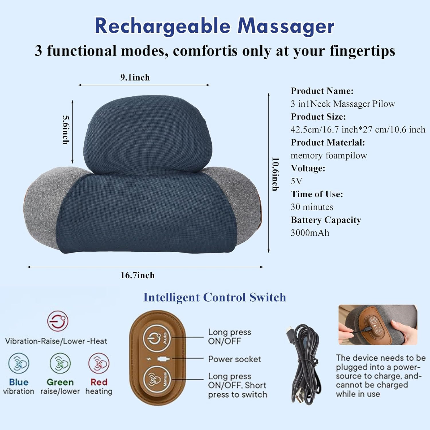 3 in 1 Heated Neck Massage Pillows with Heat for Pain Relief Deep Tissue, Rechar