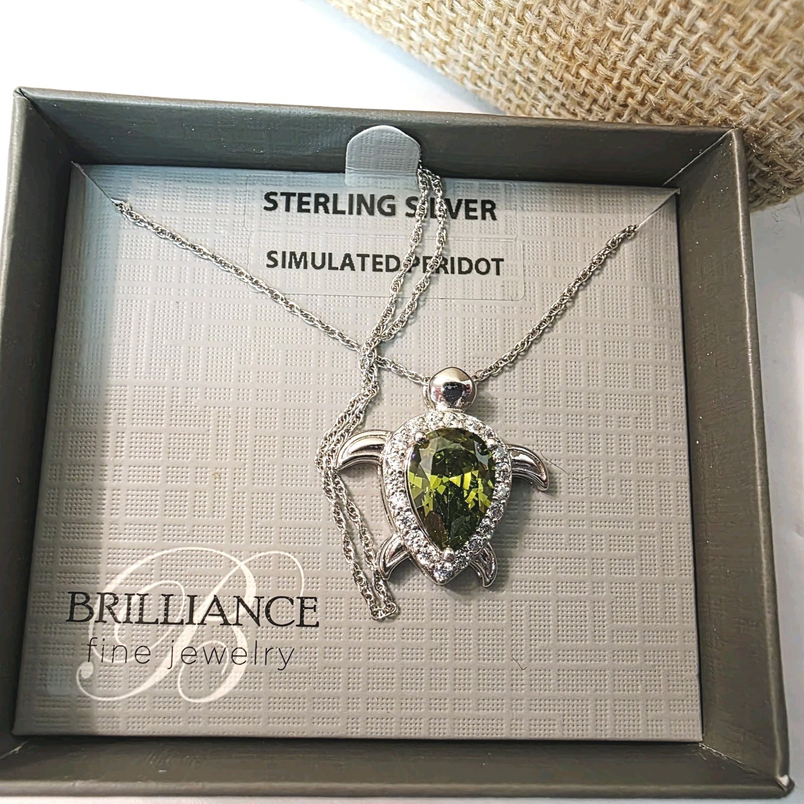 Sterling Silver Simulated Peridot CZ Trim Turtle Charm Pendant Necklace 18