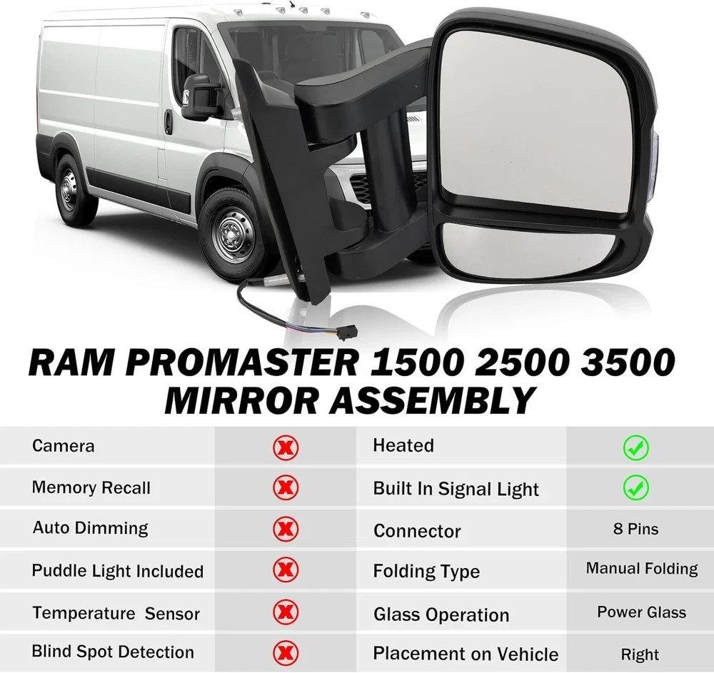Passenger Right Side Mirror for 2019 2020 2021 2022 RAM Promaster 1500 2500 3500