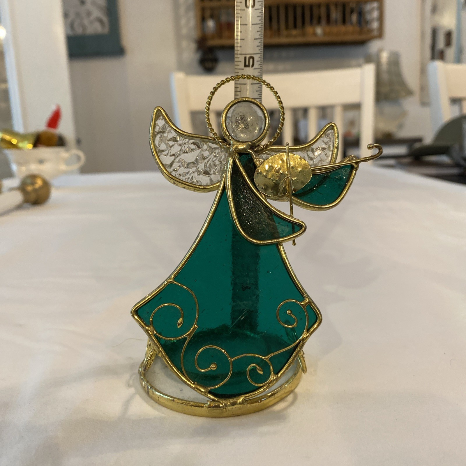 Stained Glass Angel W/ Violin 5 w/ Green Dress Standing Sun Catcher Gold Tone