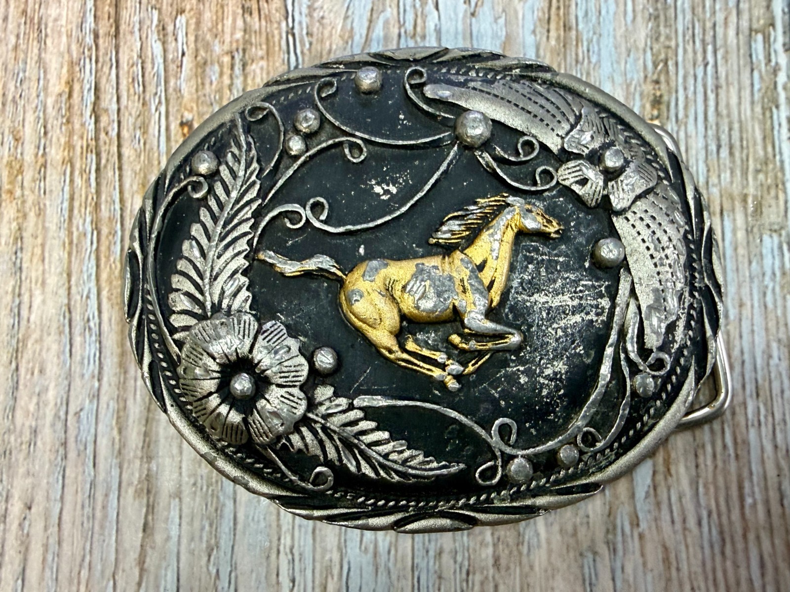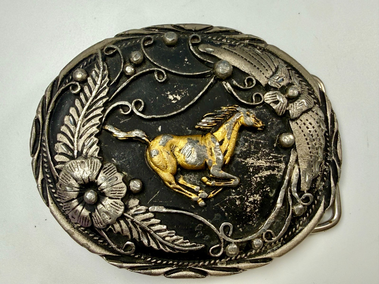 Native American Horse Feathers Flower Handcrafted Southwestern SSI Belt Buckle
