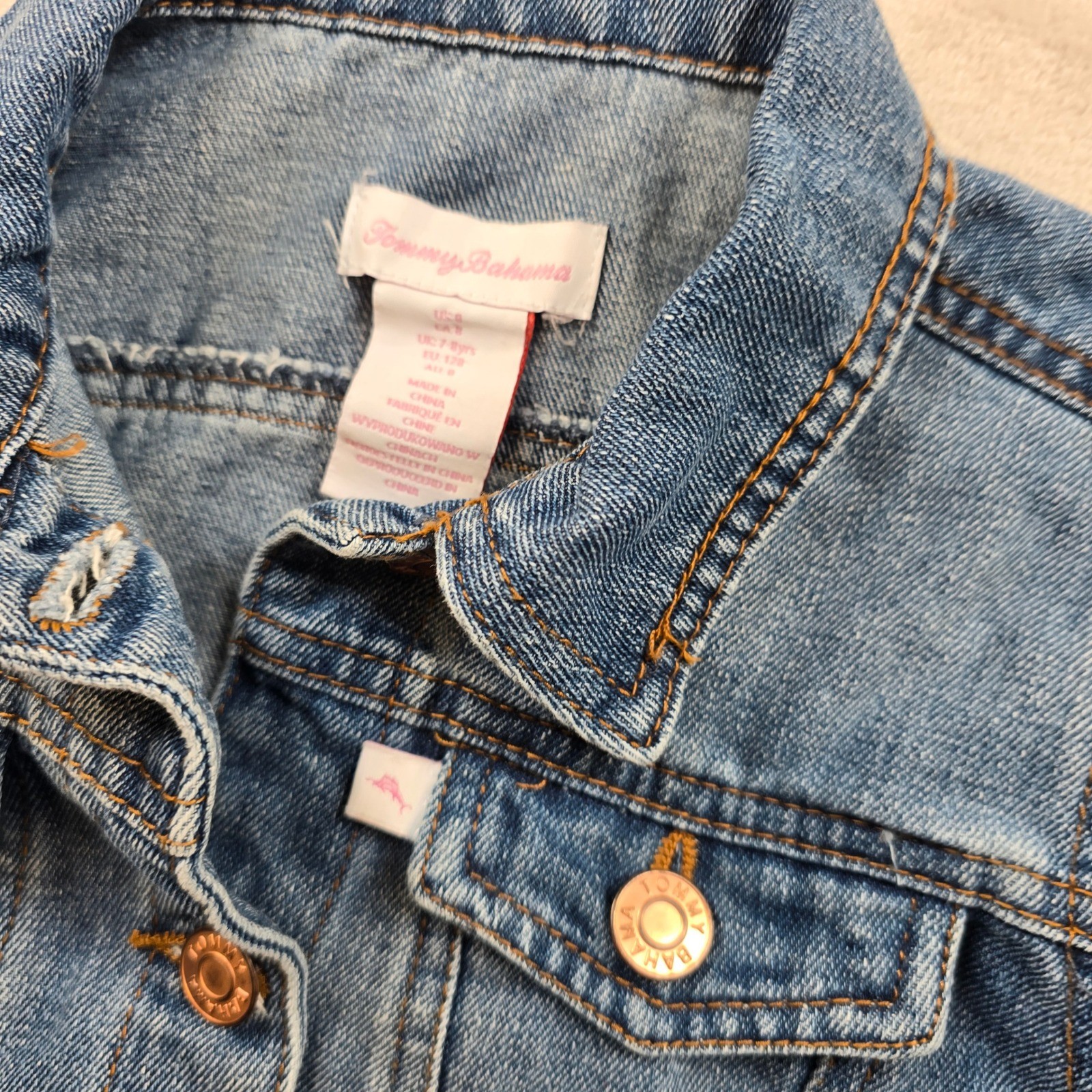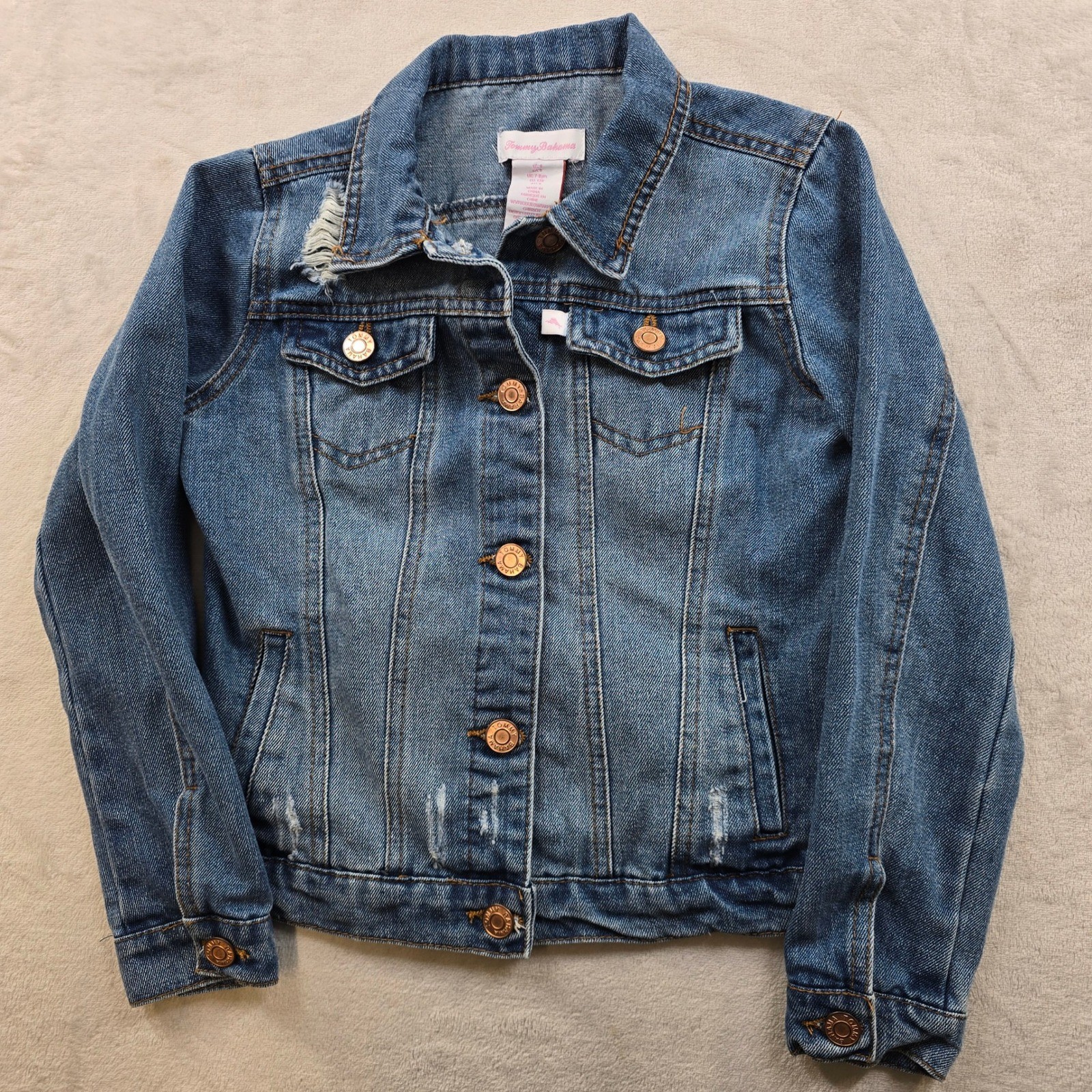как выглядит Tommy Bahama Blue Denim Trucker Jacket Girls 8 Distressed Medium Wash фото