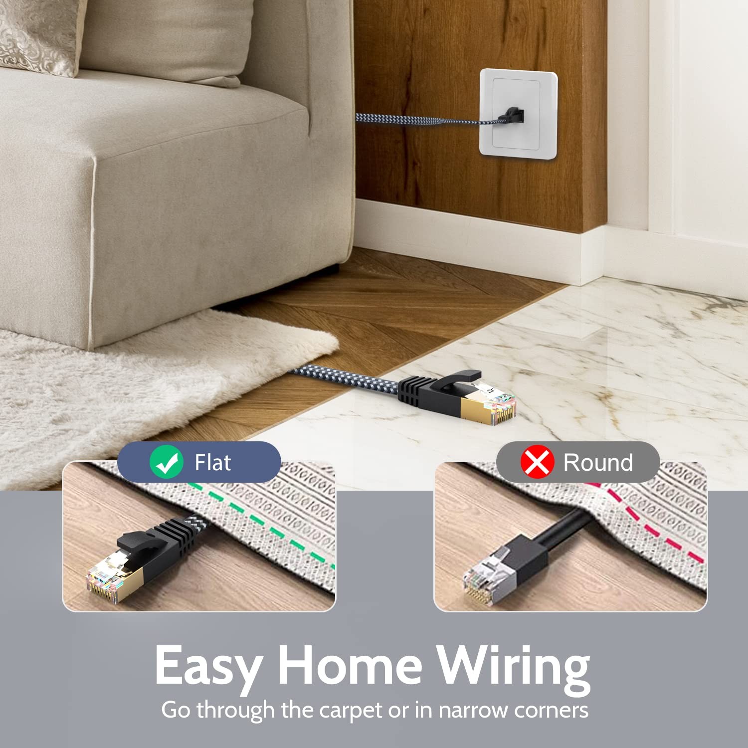 Cat 7 Ethernet Cable 25ft - Nylon Braided Flat High Speed 25FT, Silvery Black