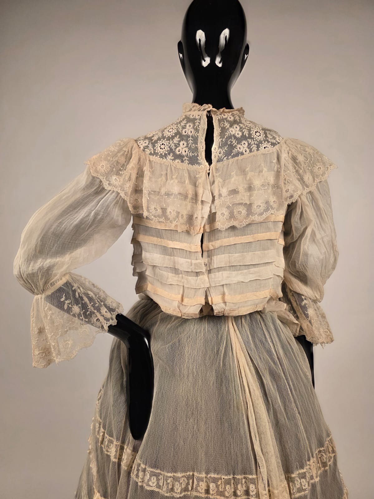 EARLY EDWARDIAN NET MUSLIN DRESS W SILK RIBBON TRIMS