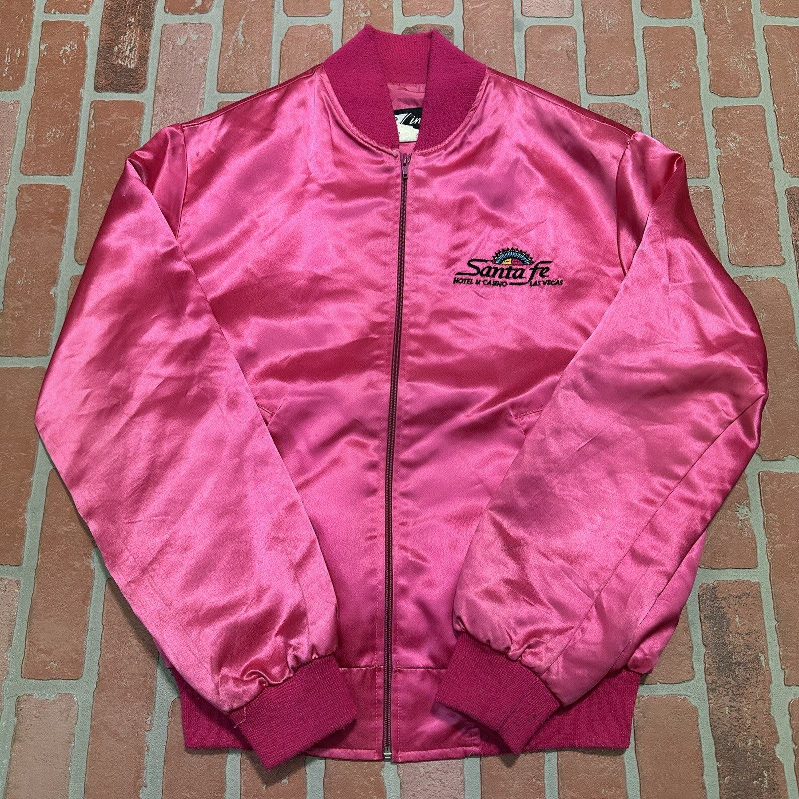 VTG 80'S SANTA FE STATION LAS VEGAS CASINO PINK SATIN BOMBER JACKET SZ L USA